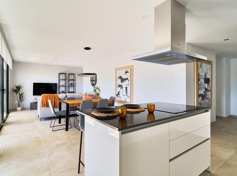 The kitchen is delivered fully equipped with integrated appliances (oven, hob, extractor hood, refrigerator, dishwasher, microwave, and washing machine), quartz countertops, and contemporary design cabinetry.