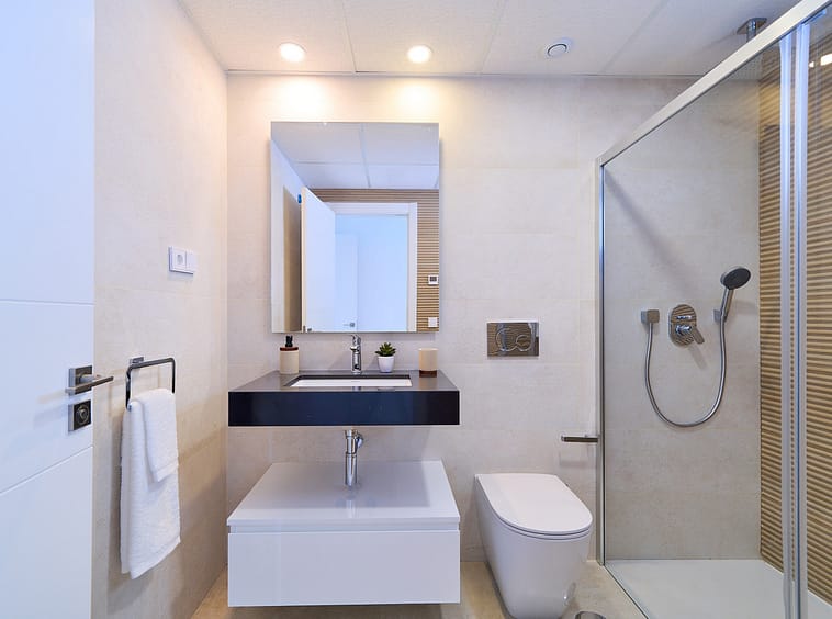 Both bathrooms feature high-quality sanitary ware and fittings, resin shower trays, and suspended furniture with LED lighting.