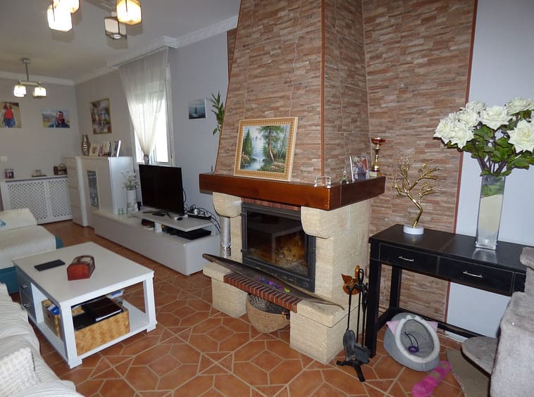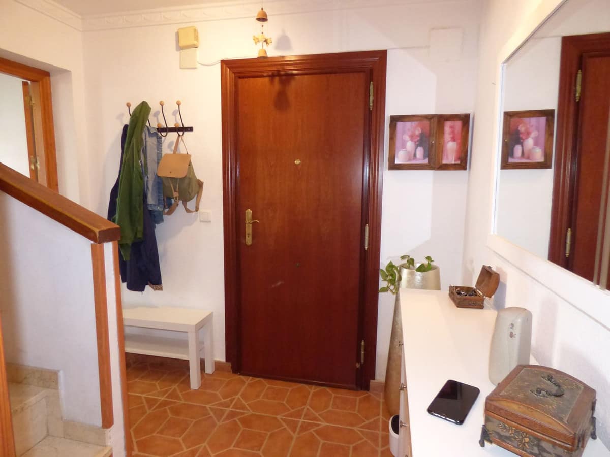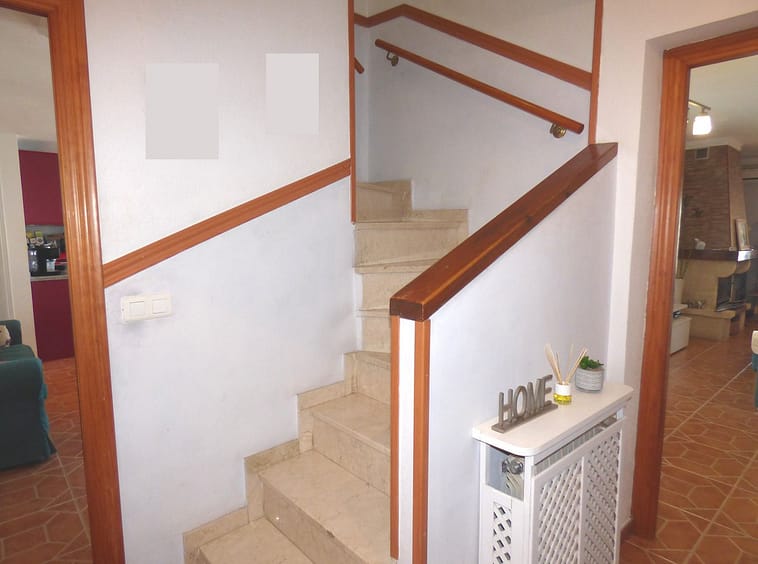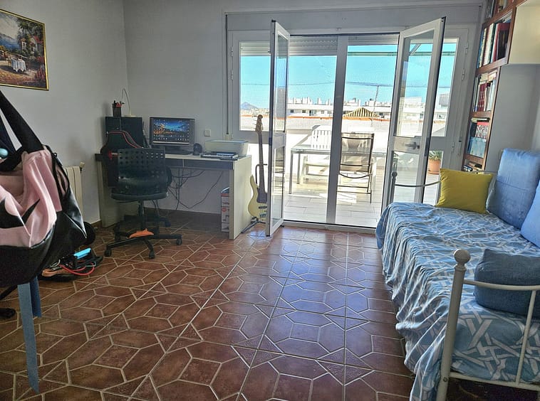 On the main floor you’ll find a spacious kitchen with room for a dining table, a guest WC, a cozy living room, an enclosed terrace currently used as an office/fourth bedroom, and access to the large open terrace.