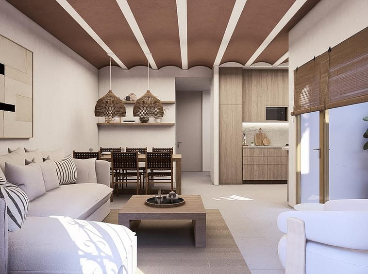 The project blends a contemporary interpretation of Andalusian architecture with a modern, refined design. The palette of neutral tones, warm whites, and natural wood creates an elegant and timeless aesthetic.