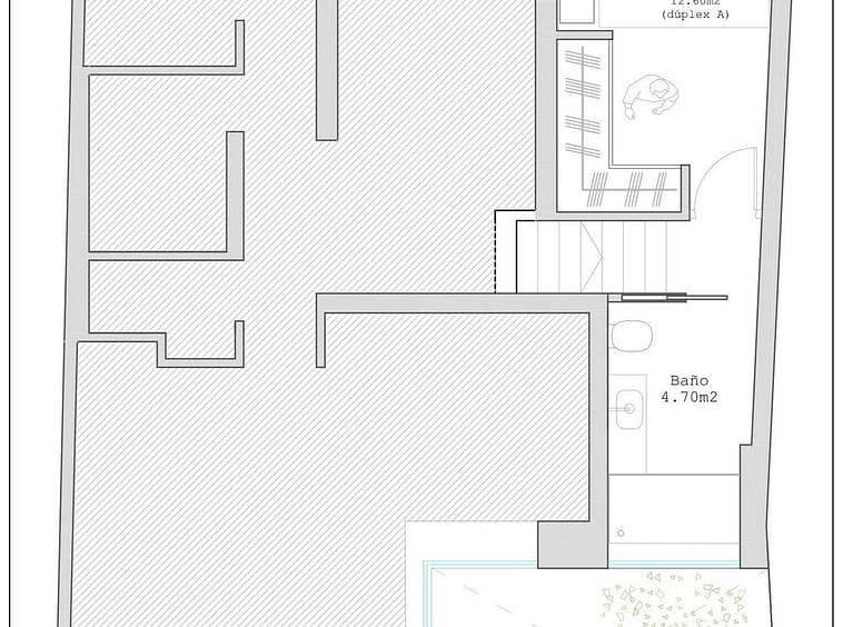 The ground floor features a spacious open-plan living, dining, and kitchen area, which opens onto a charming 14 m² interior patio that provides abundant natural light and ventilation. This level also includes two bedrooms, a full bathroom, and a guest toilet.