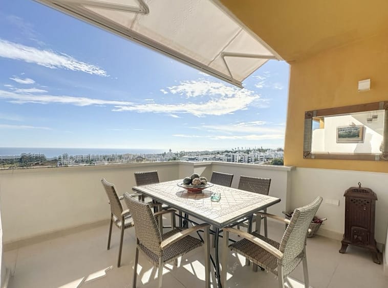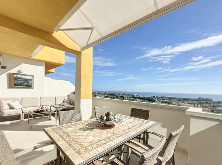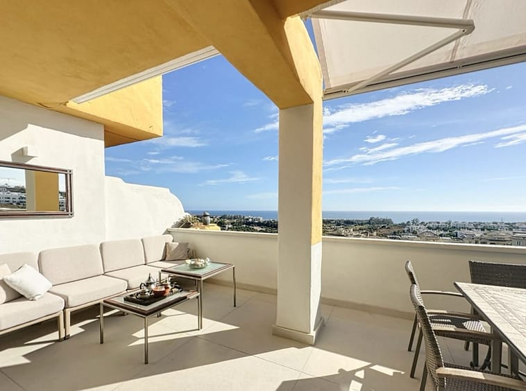 The **main terrace**, spacious and perfectly south-facing, features a **large electric parasol**, allowing you to adjust the shade effortlessly. It is ideal for enjoying breakfast with sea views or dining outdoors while taking advantage of the Costa del Sol’s exceptional climate.