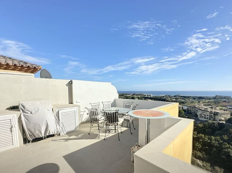 Located in a gated community surrounded by nature, the penthouse occupies a privileged elevated position offering **uninterrupted panoramic views of the Mediterranean Sea**—and on clear days, the vistas extend breathtakingly all the way to the **African coastline**, making every sunrise and sunset truly spectacular.
