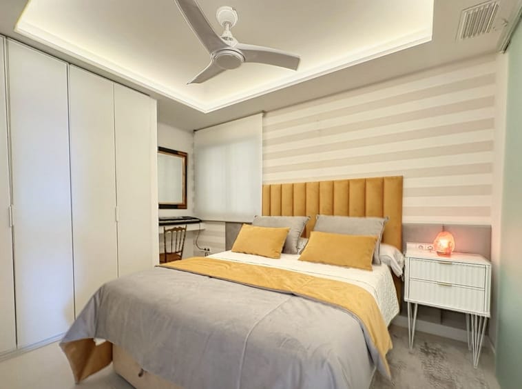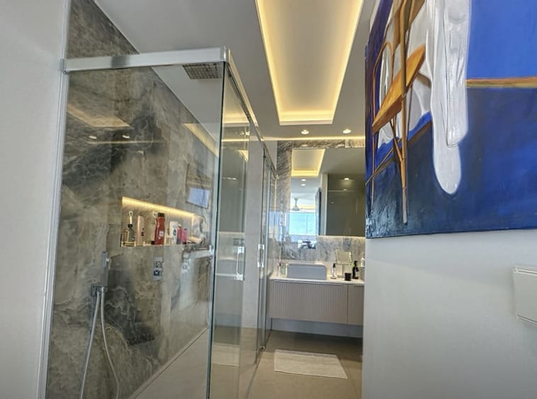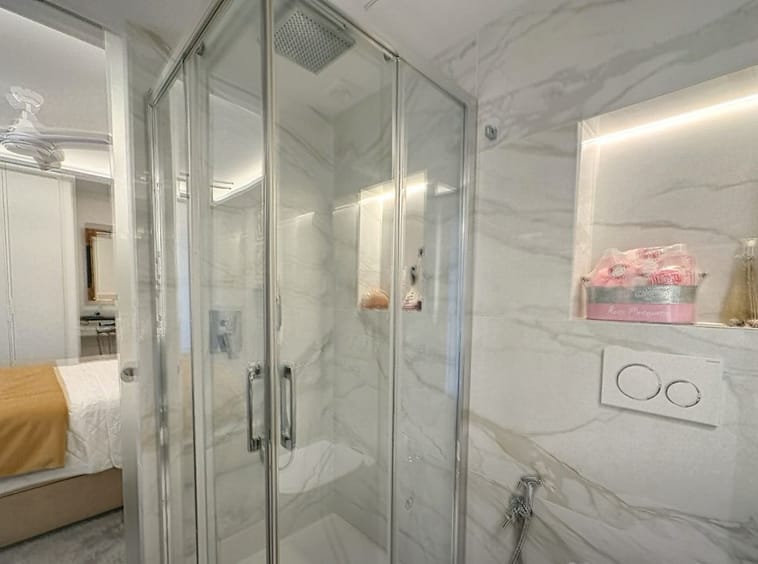 All three bedrooms are spacious and filled with natural light, and each is equipped with **electric shutters**, providing comfort, privacy, and full control over brightness. Two of the bedrooms include beautifully redesigned **en-suite bathrooms**. The master suite features a generous spa-style bathroom, a custom-made **walk-in closet**, and an elegant **coworking area**, ideal for working from home with complete tranquility.