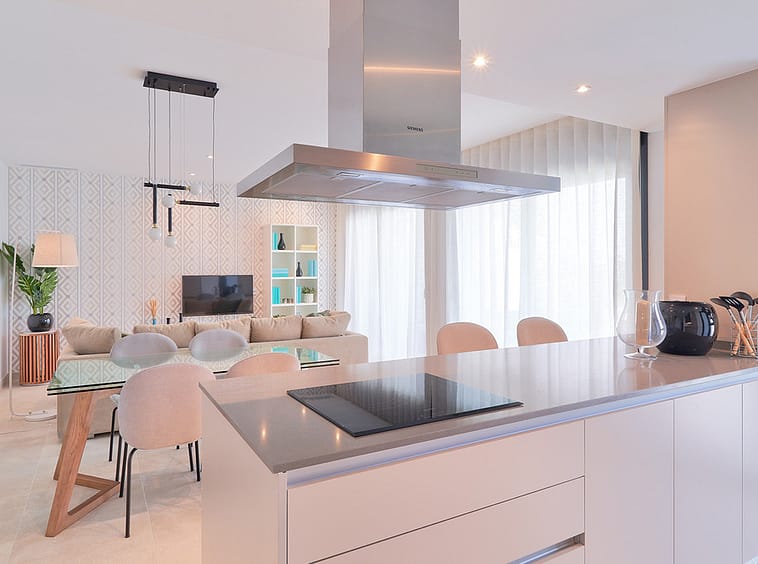 The kitchen is delivered fully equipped with integrated appliances (oven, hob, extractor hood, refrigerator, dishwasher, microwave, and washing machine), quartz countertops, and contemporary design cabinetry.