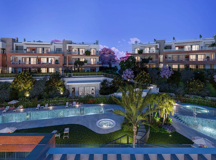 The residential complex offers over 6,700 m² of communal areas with outdoor swimming pools (including a heated one), jacuzzis, ornamental lake, gym, children's areas, and extensive landscaped gardens.