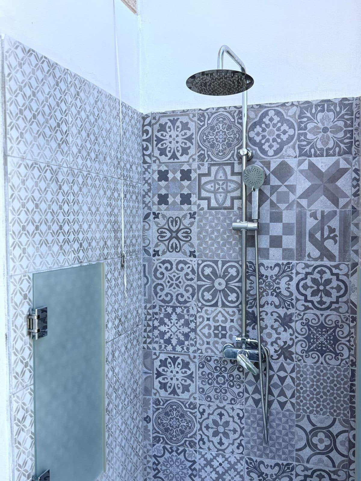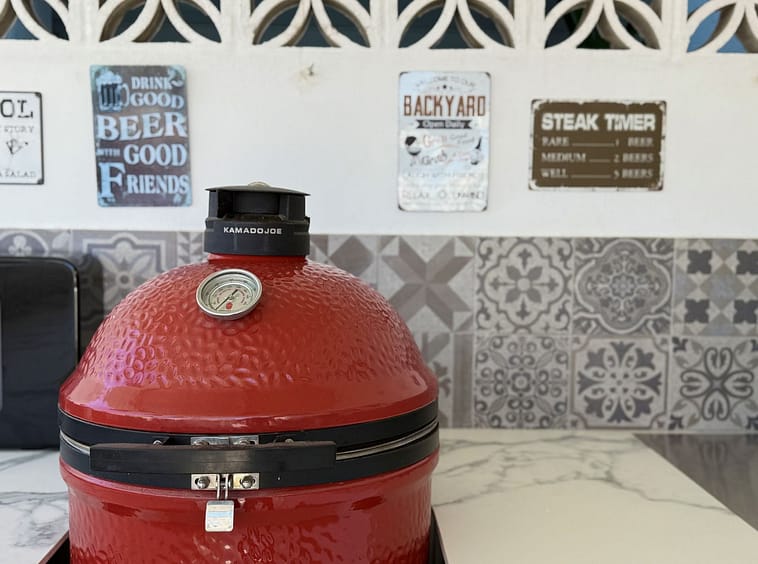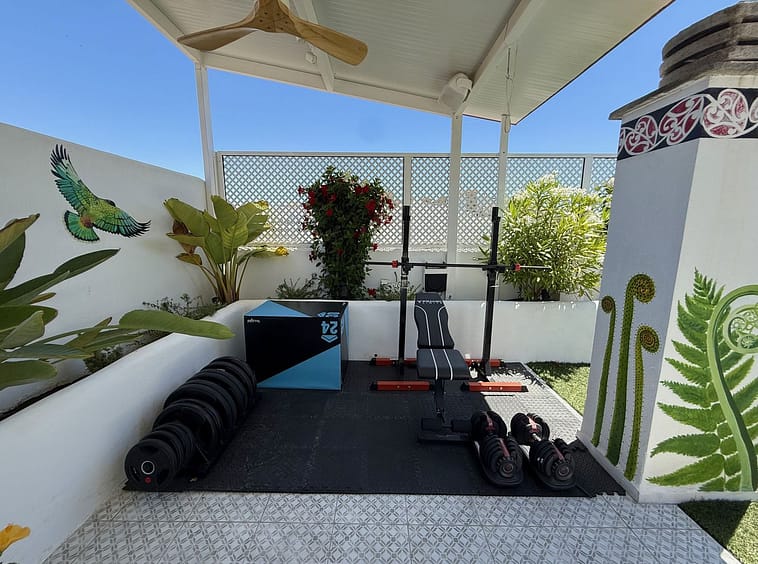 The 98 m² terrace, located on the same level as the apartment, extends the living space outdoors. It includes a fully equipped outdoor kitchen with barbecue, sink, and fridge, a dining area for six, a bar section, outdoor shower, and even a private gym. Part of the terrace is enclosed in glass and currently used as a home office with AC – which can also serve perfectly as an extra guest room.