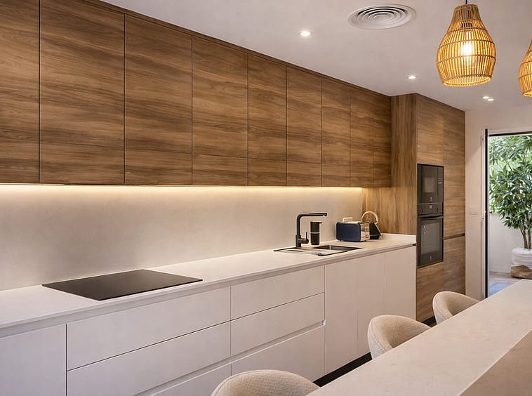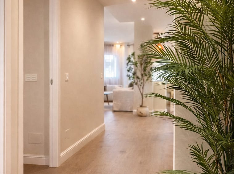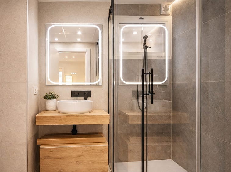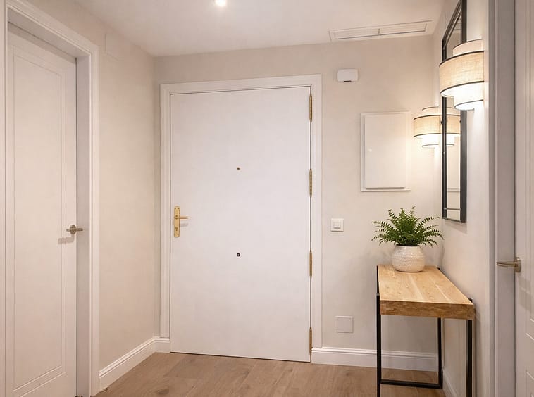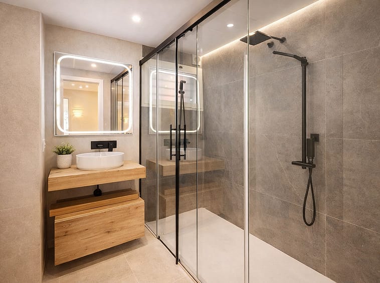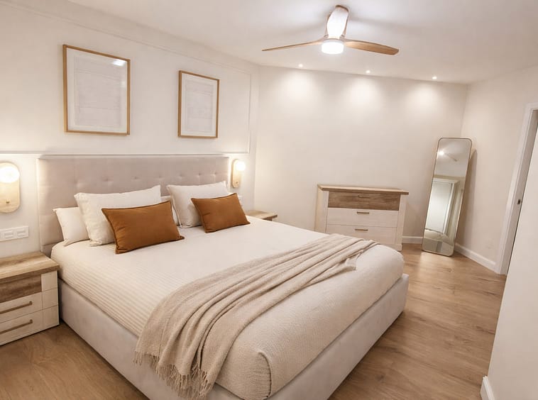 The apartment features three spacious bedrooms, all with new, lined, and illuminated built-in wardrobes, as well as ceiling fans and a powerful air conditioning system (8,000 frigories) that ensures maximum comfort throughout the year. The master bedroom has an en-suite bathroom with a modern shower and access to a balcony overlooking the interior of the complex, while the other two bedrooms—one currently used as a dressing room—share a second full bathroom. Both bathrooms stand out for their complete renovation with top-quality finishes, each featuring exterior windows that provide perfect ventilation. They include sliding glass shower screens designed to offer greater comfort and elegance.