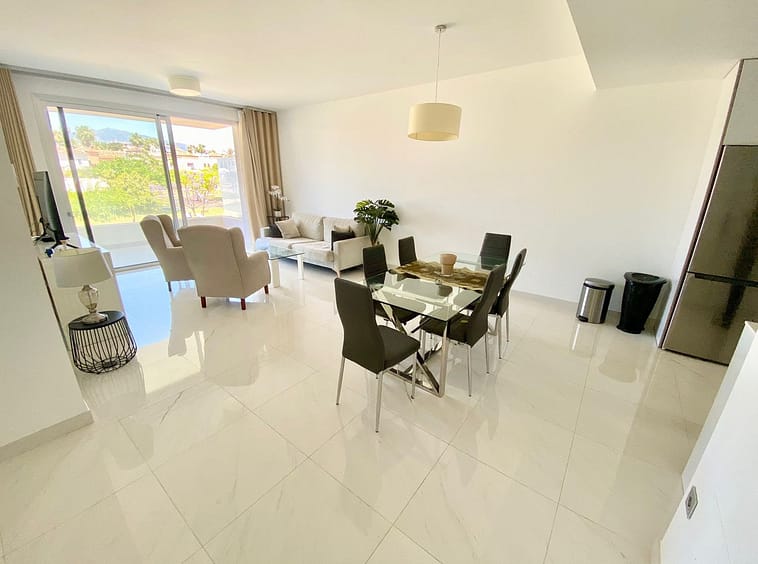 Immaculate unit in a superb location, walking distance to the wonderful beaches of Costalita (10 mn) and to a commercial area (5mn) with everything you need: supermarkets, restaurants, cafés, pharmacy, bank… No need for a vehicle. Furthermore, the location of the urbanisation is highly desired, in calm and trendy Bel Air, right between Marbella and Puerto Banus (15mn) and central Estepona (10mn). As you enter, you will find a large living room and open plan kitchen, fully equipped with german appliances. It leads to a fabulous 38m2 west oriented terrace, facing a recently created green area, so you are assured that nothing will ever be built and that the fantastic views will remain. Moreover, the calm that results from this promises lovely evenings overlooking the sunset. The rest of the property includes three spacious bedrooms with plenty of wardrobe space, all leading to the terrace. Bright throughout, thanks to the floor-to-ceiling ample windows. The master is huge, with en suite bathroom. There is a second full bathroom with italian shower. The urbanisation is state of the art and in great condition, it includes a garden area and large swimming pool. There is an underground parking space and a storage room, included in the price. Great opportunity, easy viewings, a must see!