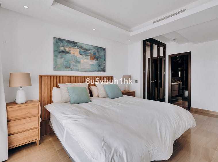 The apartment features three generously sized bedrooms, including one with an en-suite bathroom, complemented by an additional bathroom and two toilets. The living spaces are thoughtfully designed, comprising a bright and airy living room, a dining area, and a fully fitted, equipped kitchen with a utility room. High-quality finishes and modern conveniences such as air conditioning, central heating, and a ceiling cooling system ensure year-round comfort. The property also benefits from advanced aerothermic technology and solar panels, reflecting a commitment to energy efficiency.