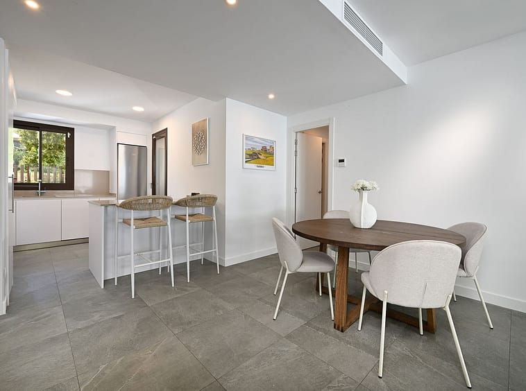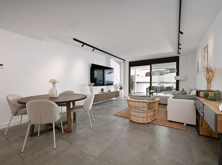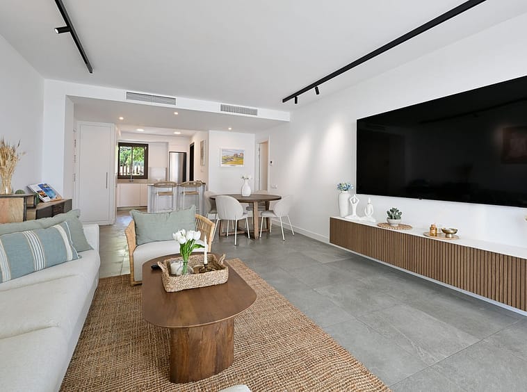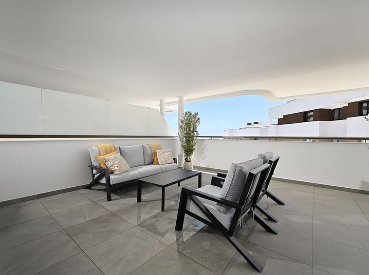 The apartment features a spacious open-plan kitchen and living room, ideal for both relaxing and entertaining. Two of the bedrooms offer direct access to a generous terrace, perfect for enjoying your morning coffee or evening sunsets with a partial sea view.