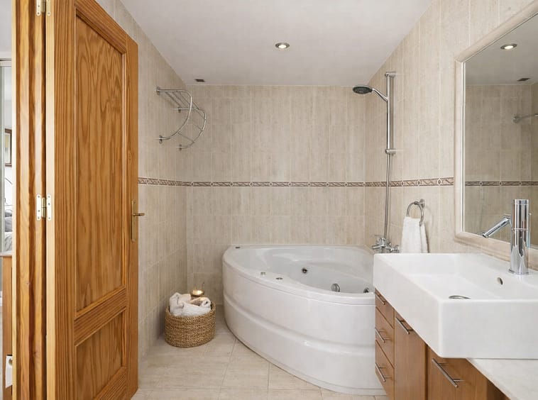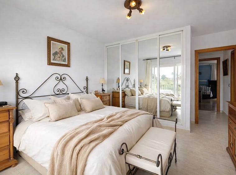 The master bedroom stands out in particular, featuring a private terrace with open views where you can even see the sea, a large built-in wardrobe, and an en-suite bathroom with a hydromassage bathtub, creating a comfortable and private retreat.