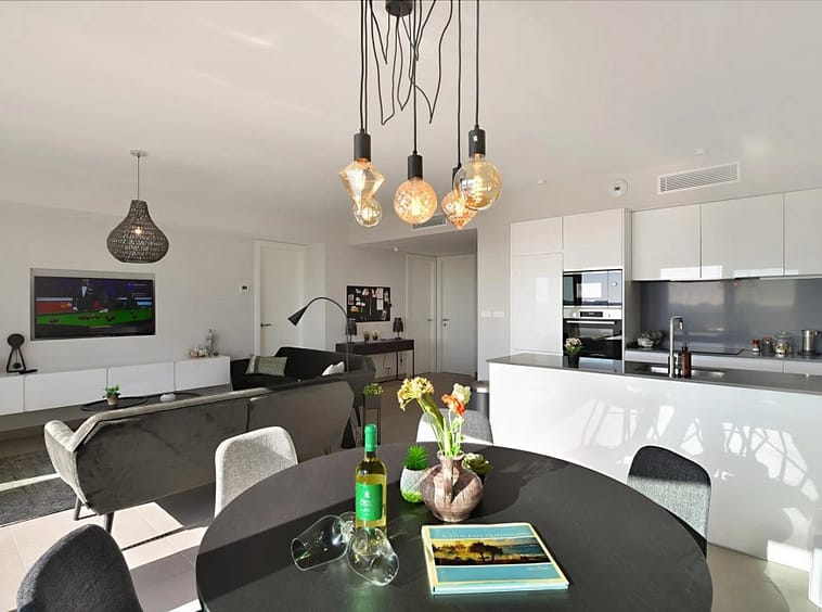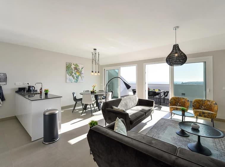 living room with comfortable seating area, dining area with 6 chairs, luxury open kitchen and sliding doors to the terrace