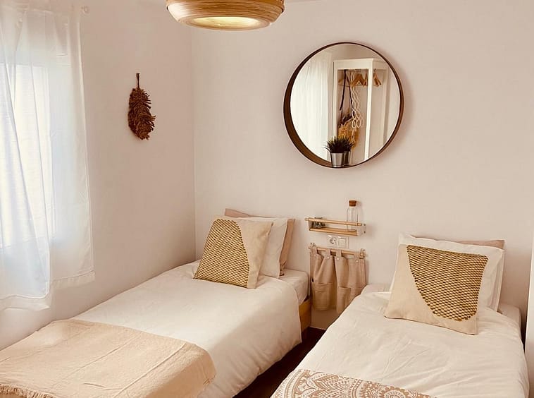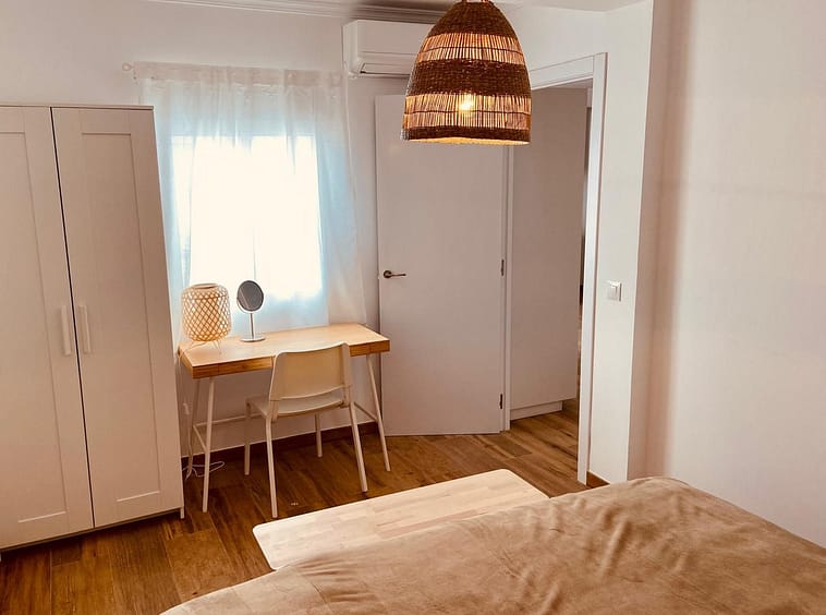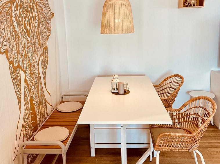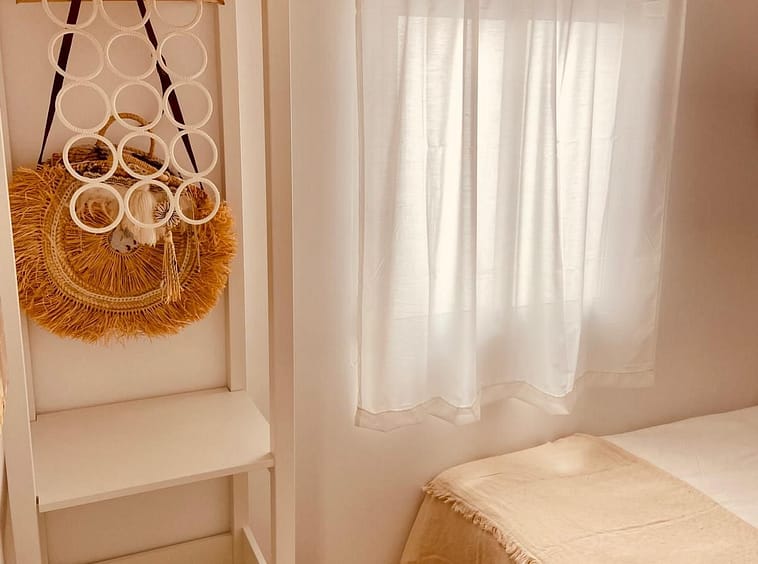This apartment was completely renovated in a Boho Ibiza style, featuring a bright white and natural wood design that creates a warm, modern, and relaxing atmosphere.