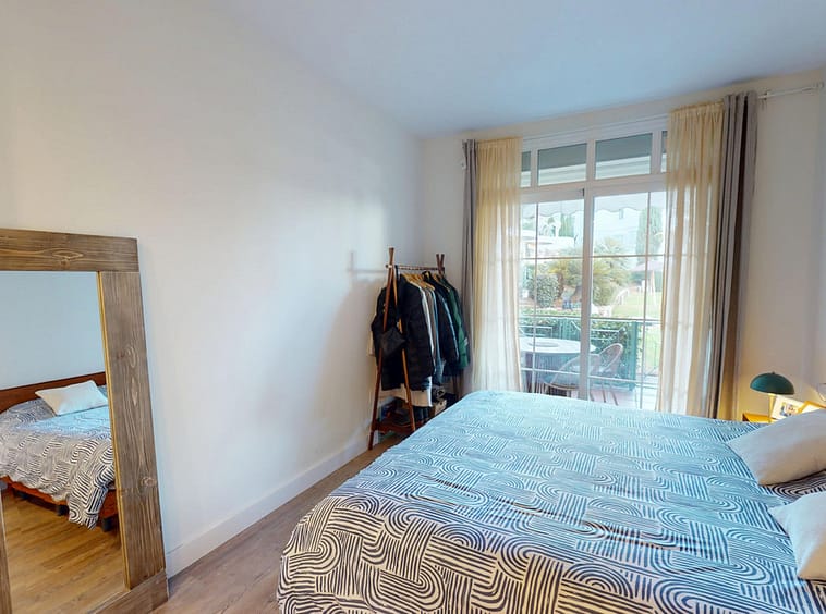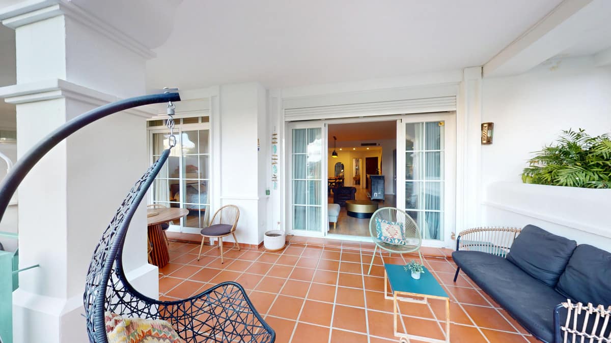The living room features a fireplace, perfect for the cooler months, as well as air conditioning with heat pump (hot & cold). From both the living room and the master bedroom there is access to a lovely covered terrace, ideal for year-round enjoyment, with direct access to one of the quietest swimming pools in the complex.