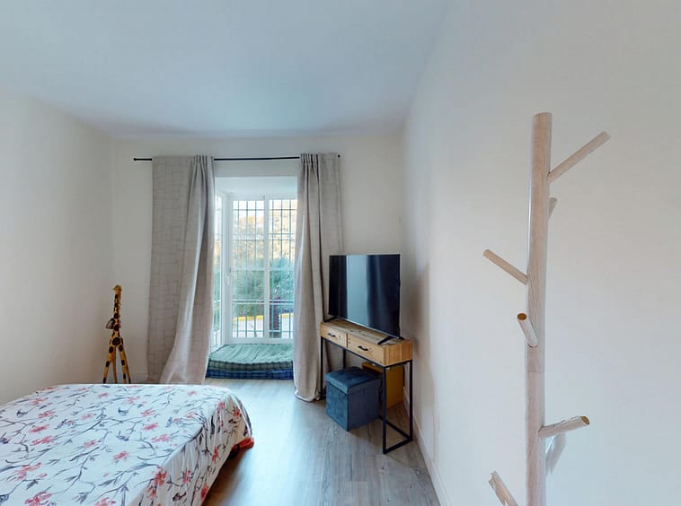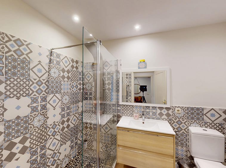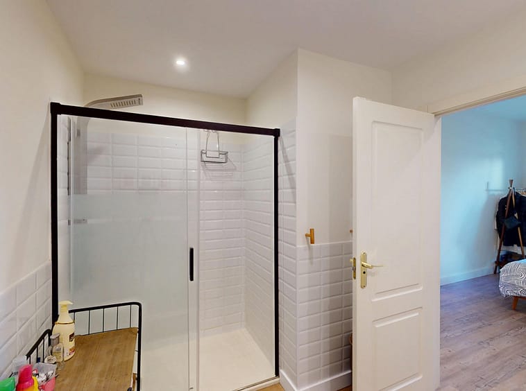 The master bedroom includes an en-suite bathroom with a modern walk-in shower, while the two additional bedrooms share a second bathroom, also with a shower.