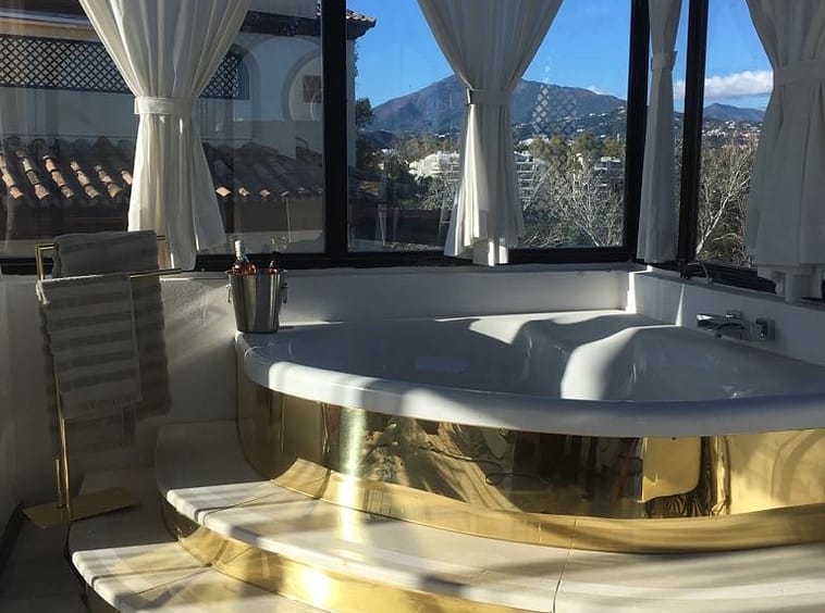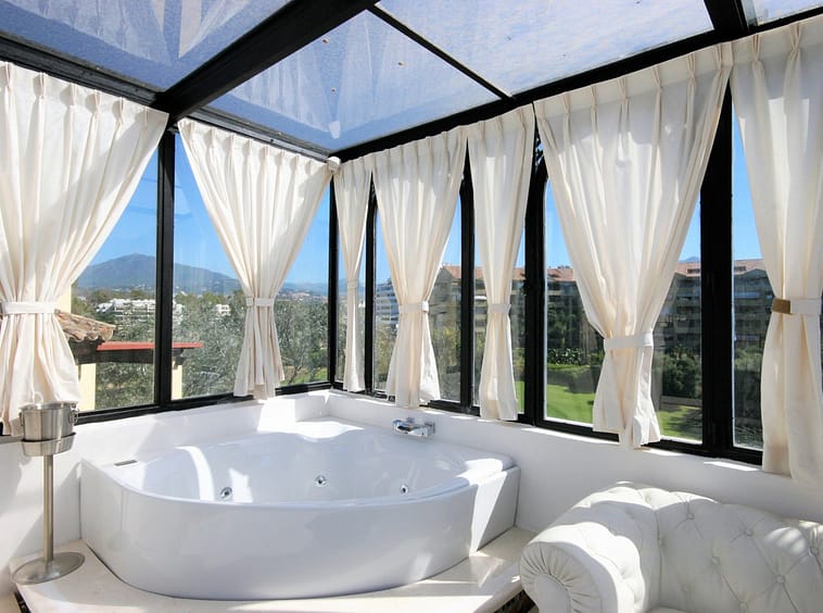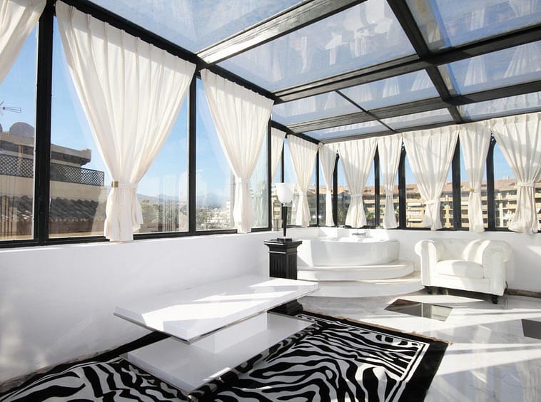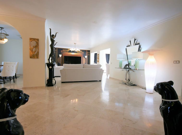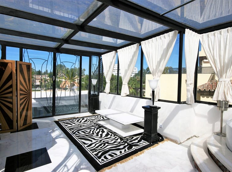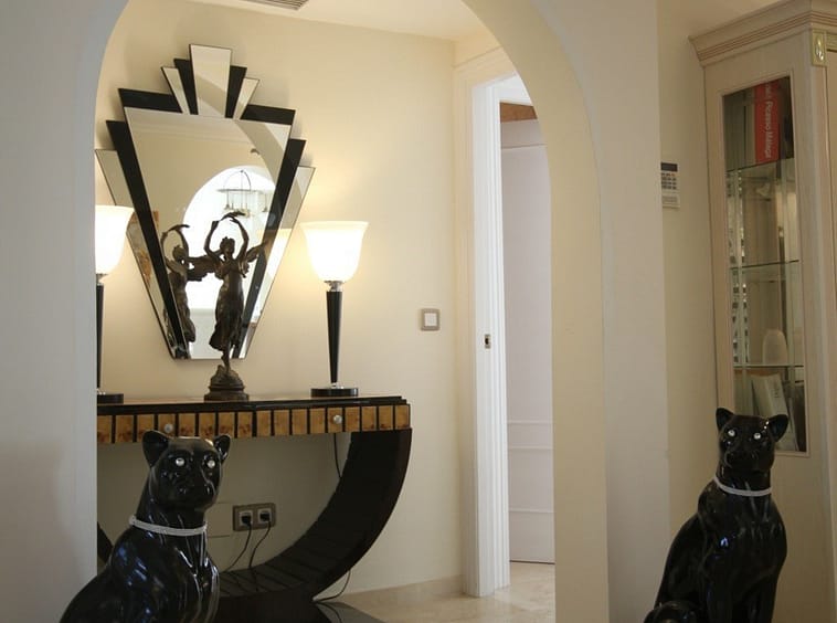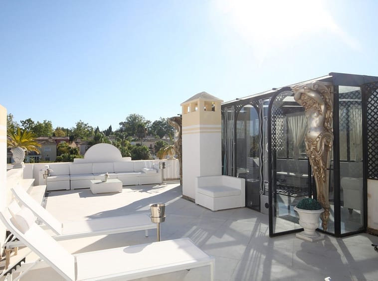 Situated frontline golf in the highly desirable area of Guadalmina Alta lies what is possible the only Art Deco apartment in the whole of Andalucia. This utterly stunning duplex penthouse is located in small quiet complex of apartments away from any road noise and yet just a short distance away from the town of San Pedro and the many restaurants and amenities of Guadalmina. Upon entering the property you immediately get a sense of space and opulence, due to both the distribution and the incredible decor and furnishings throughout the penthouse. On the main level you have an enormous living room with a separate dining area off to the left and a further sitting area off the living room to the right which over looks the Guadalmina golf course. The exquisite furnishings and decor are unique Art Deco pieces from around the world, many of which have great provenance and have come from America via auction houses in Paris, London and Rome. The thought and attention to detail that has gone into this Art Deco property is absolutely outstanding and must been seen first hand to be able to truly appreciate in its entirety. As you would expect, the fully fitted kitchen is in keeping with the rest of the house in terms of both quality and design, and that continues of course through into both the large master suite and the second bedroom with it own adjoining bathroom. A staircase leads from the dining area up to an exquisitely designed conservatory/ bedroom suite with jacuzzi, which again enjoys the amazing views out over the golf course. This in turn leads out onto 65m2 solarium with a Jacuzzi, again all this conforming with the elegant Art Deco style.