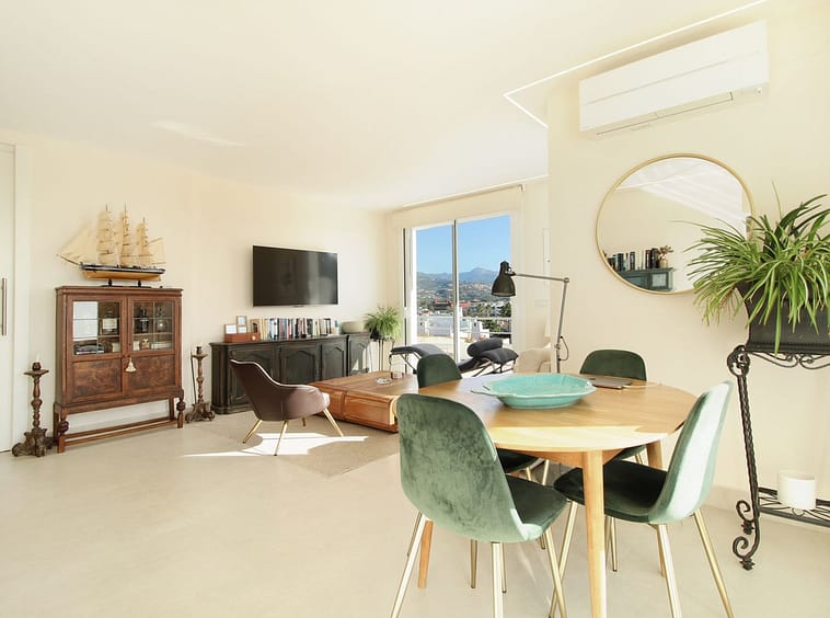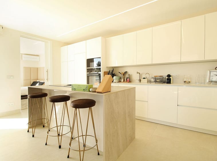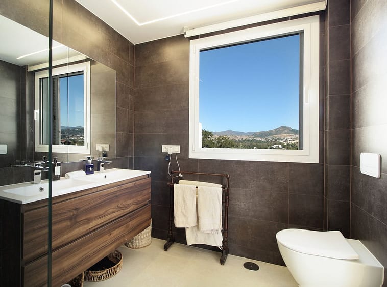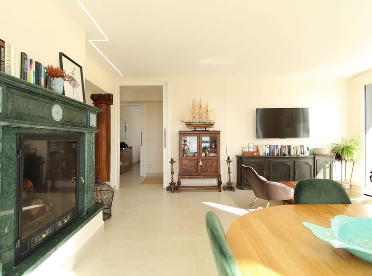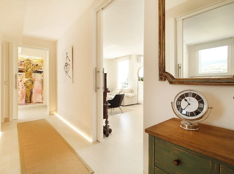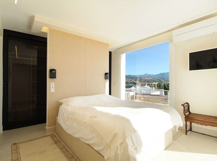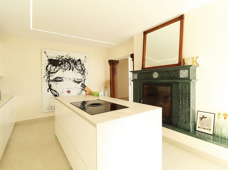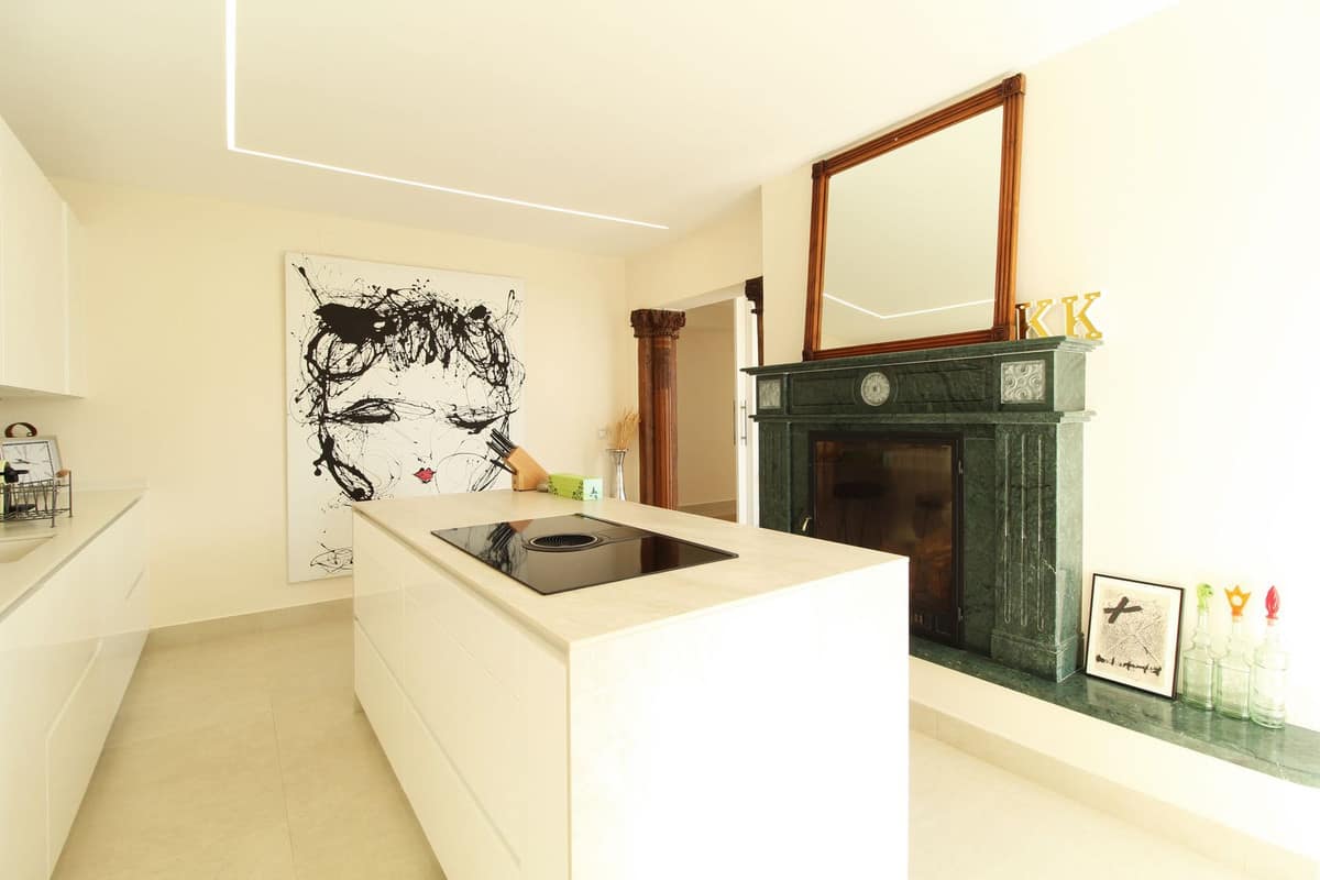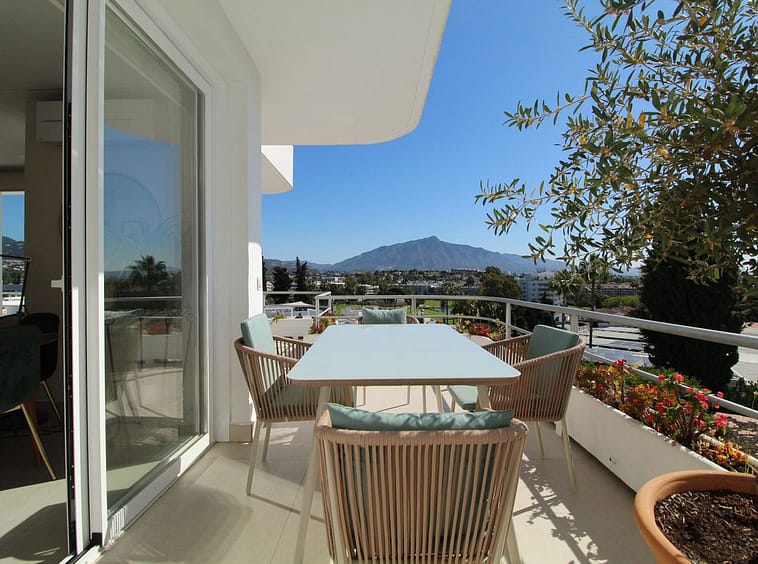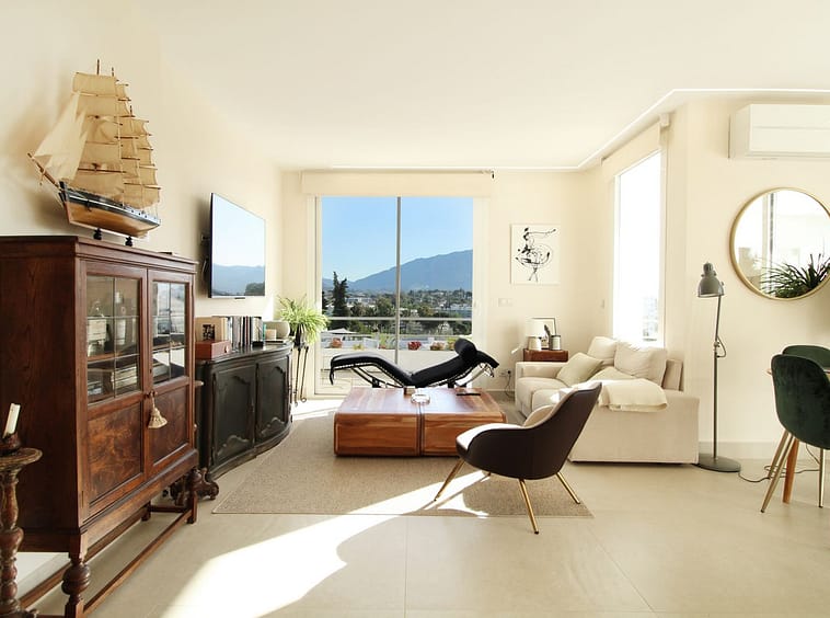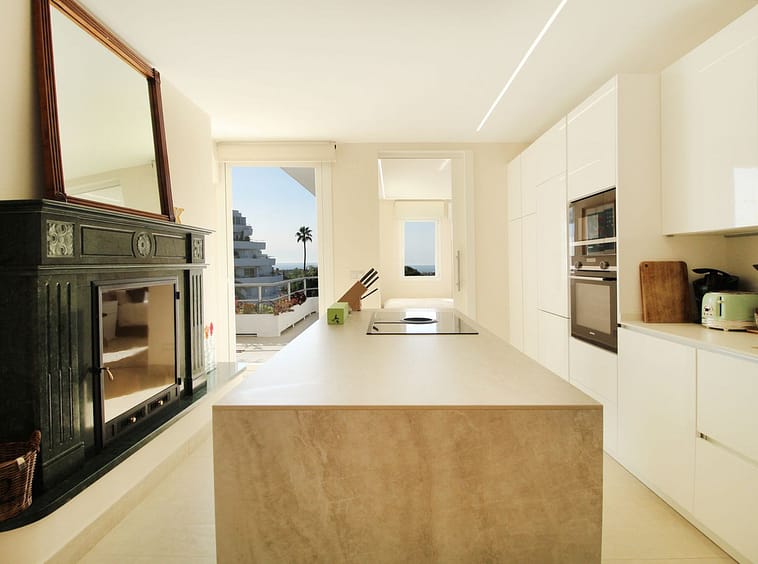 Upon entering the hallway, you notice the light and airy feeling eminating from this corner apartment. To your right , the double aspect living room is bright and spacious with various accesses to the terraces, and it benefits from breathtaking views of the Mediterranean Sea, the golfcourse, and the iconic la Concha Mountain. There is a fully functioning centre piece fireplace that serves both the living room and kitchen which is separated from the living area through stylish ornamental arches. The fully fitted kitchen boasts the latest appliances and premium finishes. A large island with plenty of space means culinary lovers will be able to prepare their favourite meals in a stylish and functional setting. One of the distinguished features of this property is its large wrap around terrace, spanning nearly 50 square metres – perfect for enjoying the outdoor lifestyle that Marbella is known for. Whether entertaining, relaxing, or simply admiring the picturesque surroundings, this terrace provides exceptional space and those incredible views.