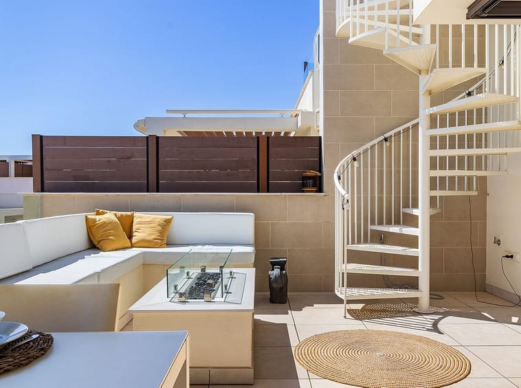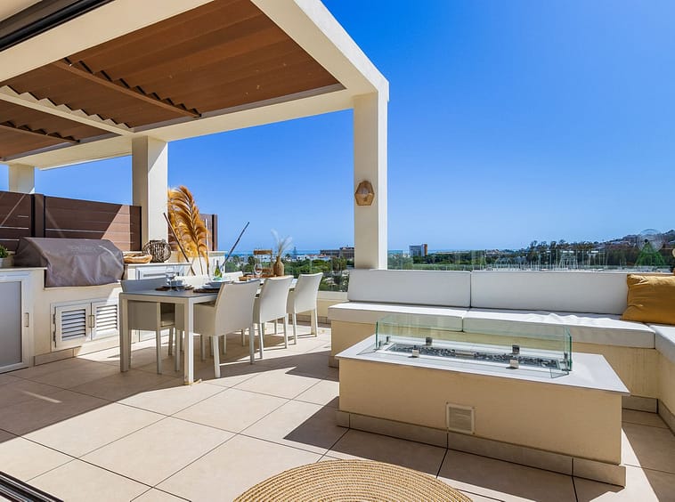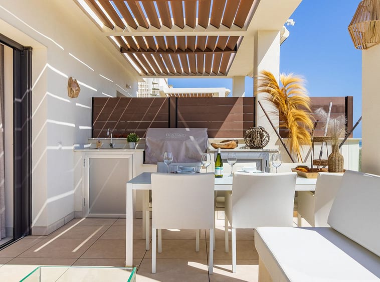 The penthouse is on the first floor. It is stylishly furnished and has a large terrace plus a solarium with a private plunge pool where you can relax in the sun. The terrace also has an outdoor kitchen with a dining table and 6 chairs, comfortable lounge furniture with a gas fire place on the terrace. From the terrace you can enjoy views of the surrounding area, the sea and the mountains of Mijas.