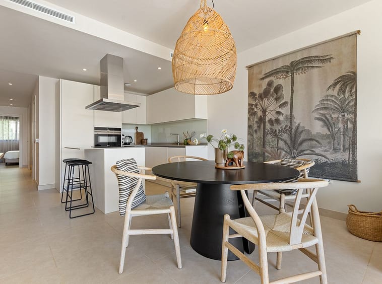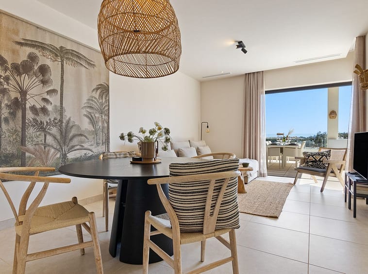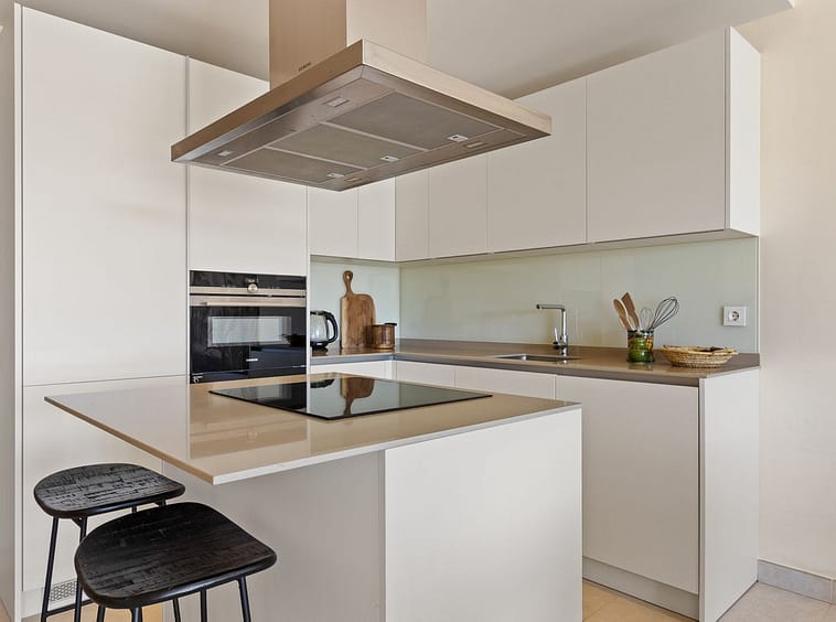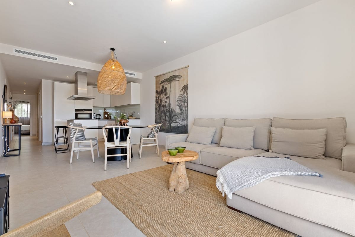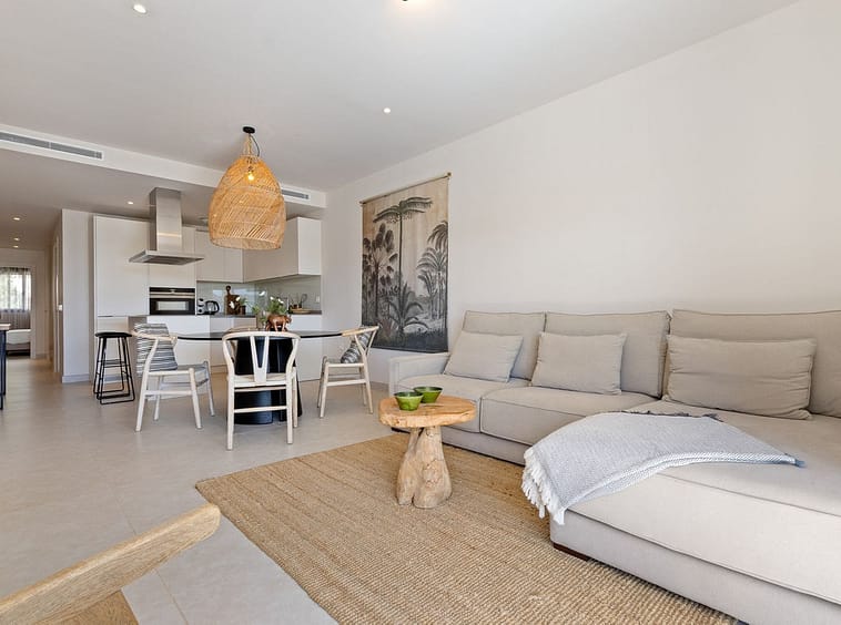 The modern furnished living/dining room has a fully equipped modern open plan kitchen with an island. Sliding glass doors lead out to the spacious private terrace.