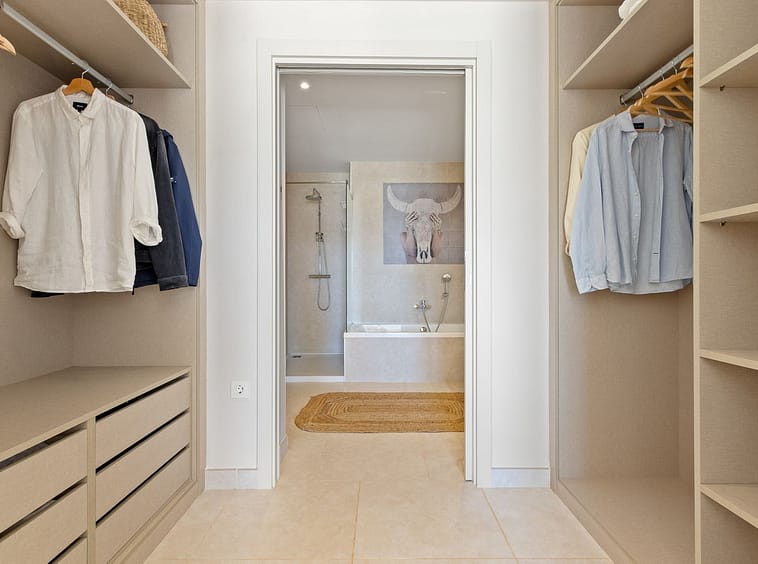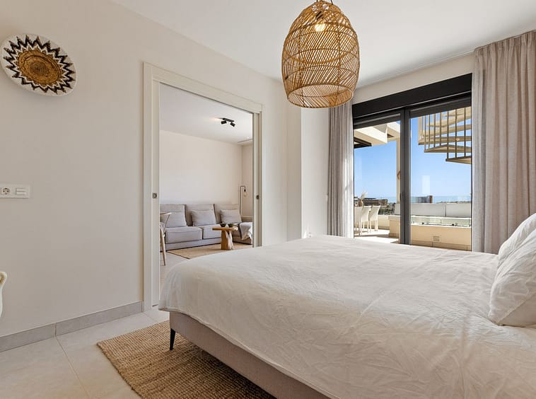 Adjacent to the living room is the spacious master bedroom with en-suite bathroom, fitted wardrobes and sliding doors to the terrace with stunning views of the surrounding countryside and the sea. The 2nd and 3rd bedrooms also have en-suite bathrooms with walk-in showers.