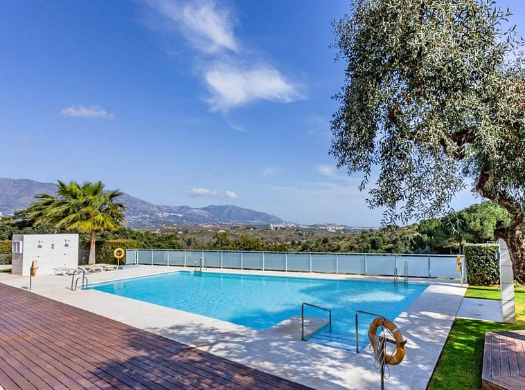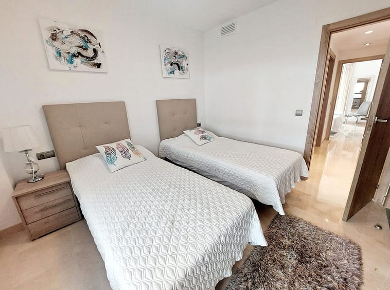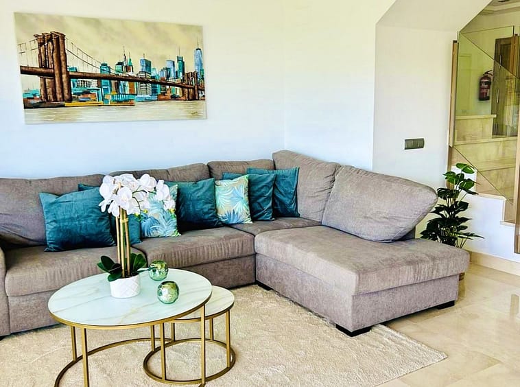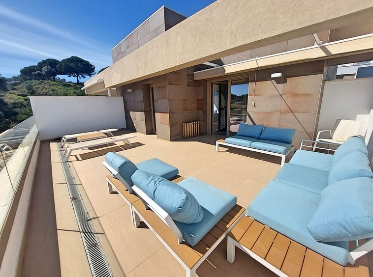A beautiful staircase with glass balustrades lead you upstairs to the upper terrace and the master suite which consists of a large master bedroom with fitted wardrobes and an elegant 2 tone bathroom with a walk in shower. The terrace on this level is genuinely stunning with all day sunshine and panoramic views to the golf and mountains. Enjoy the views from the sunbeds and stylish outdoor seating furniture and this is a terrace to genuinely enjoy yourself. The entire penthouse is sold fully furnished in an elegant and contemporary style so you simply need to enter and move in immediately and enjoy the Spanish lifestyle. There are swimming pools and community gardens to enjoy and you also have 2 garage spaces and a storage room included in the price which is right below the penthouse.