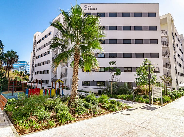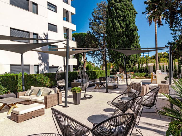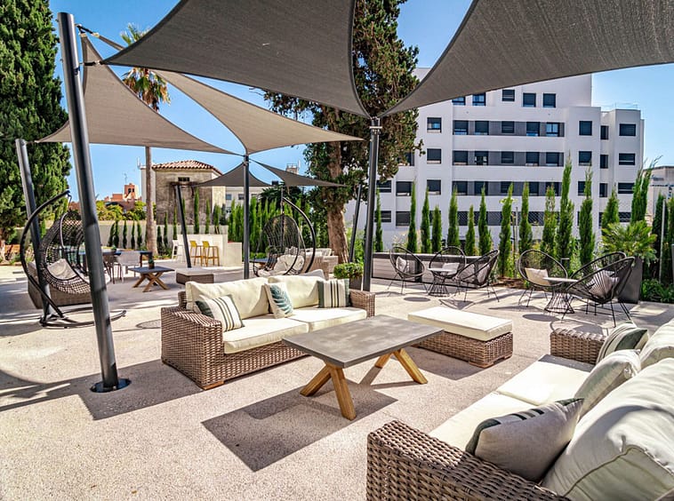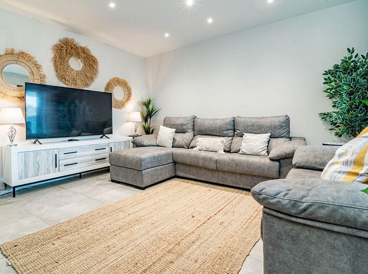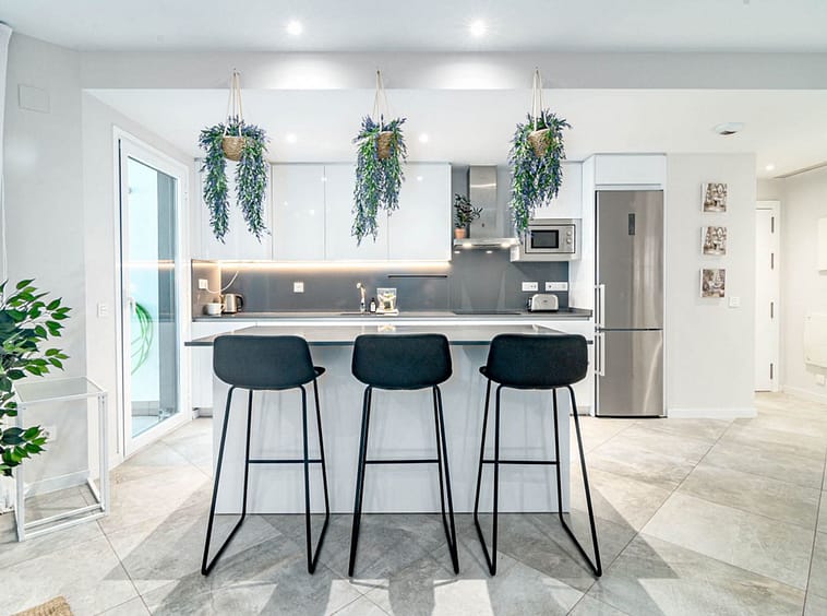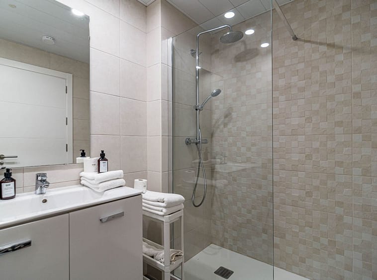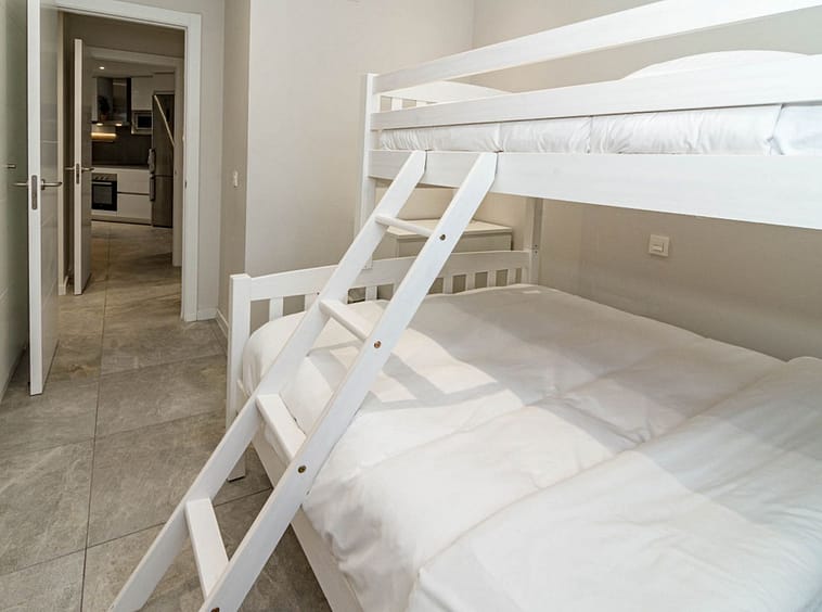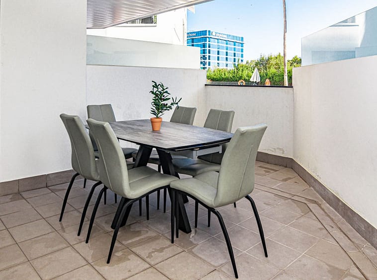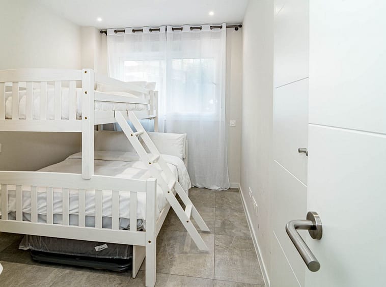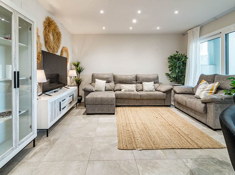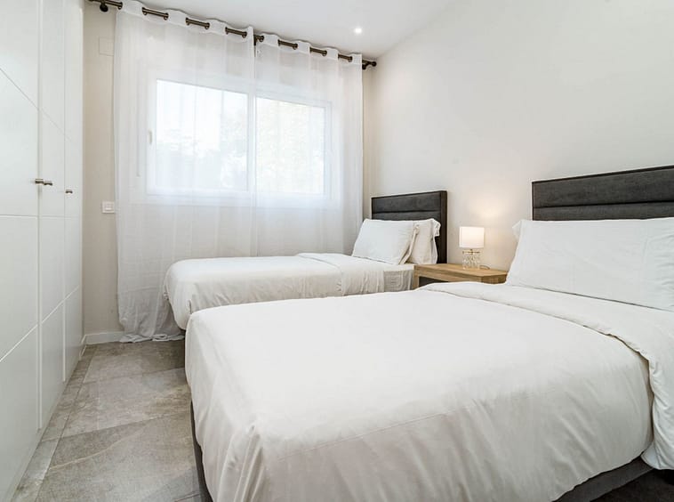 Its layout: upon entering, we find a spacious living room with an open kitchen. Both rooms connect to the covered terrace on the right side. To the left, we find a hallway with the guest bathroom on the left side. Directly opposite, there is a bedroom with built-in wardrobes. Following the hallway, we find another bedroom with wardrobes. At the far end is the master bedroom with a dressing area, an en-suite bathroom, and access to the large open terrace. All rooms are exterior-facing, with windows opening onto the private terraces. The home offers plenty of storage space; in addition to the bedroom closets and dressing room, the home also has a closet in the entryway and in the hallway connecting the bedrooms.