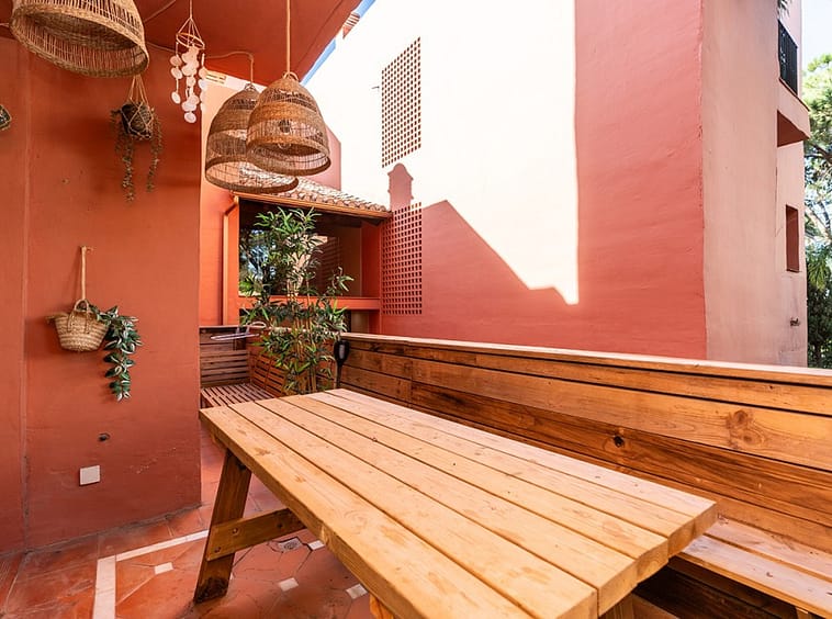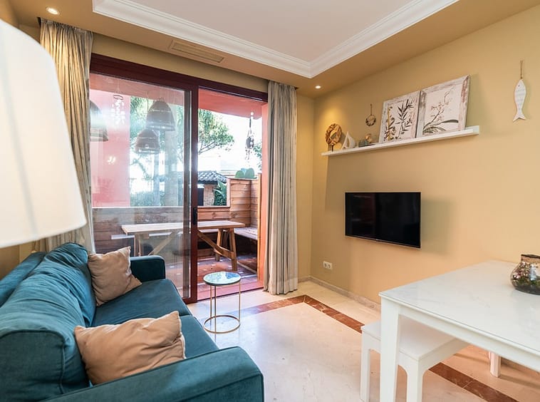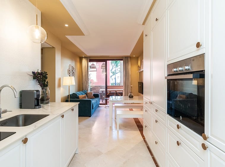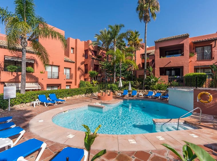 Apartment in Elviria walking distance to the beach in East Marbella offering three bedrooms, two bathrooms, one of them en-suite, a living room with fully equipped open plan kitchen and access to the terrace. The apartment offers AC hot and cold, marble floors, double glazing windows, an underground parking space and a storage room. The complex is very well maintained and offers three pool areas, a small gym, sauna and security. The apartment has a holiday licence. All local amenities are within walking distance. Elviria also offers an amazing golf Santa María Golf. Marbella centre is only a short drive away.