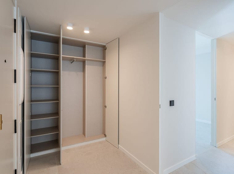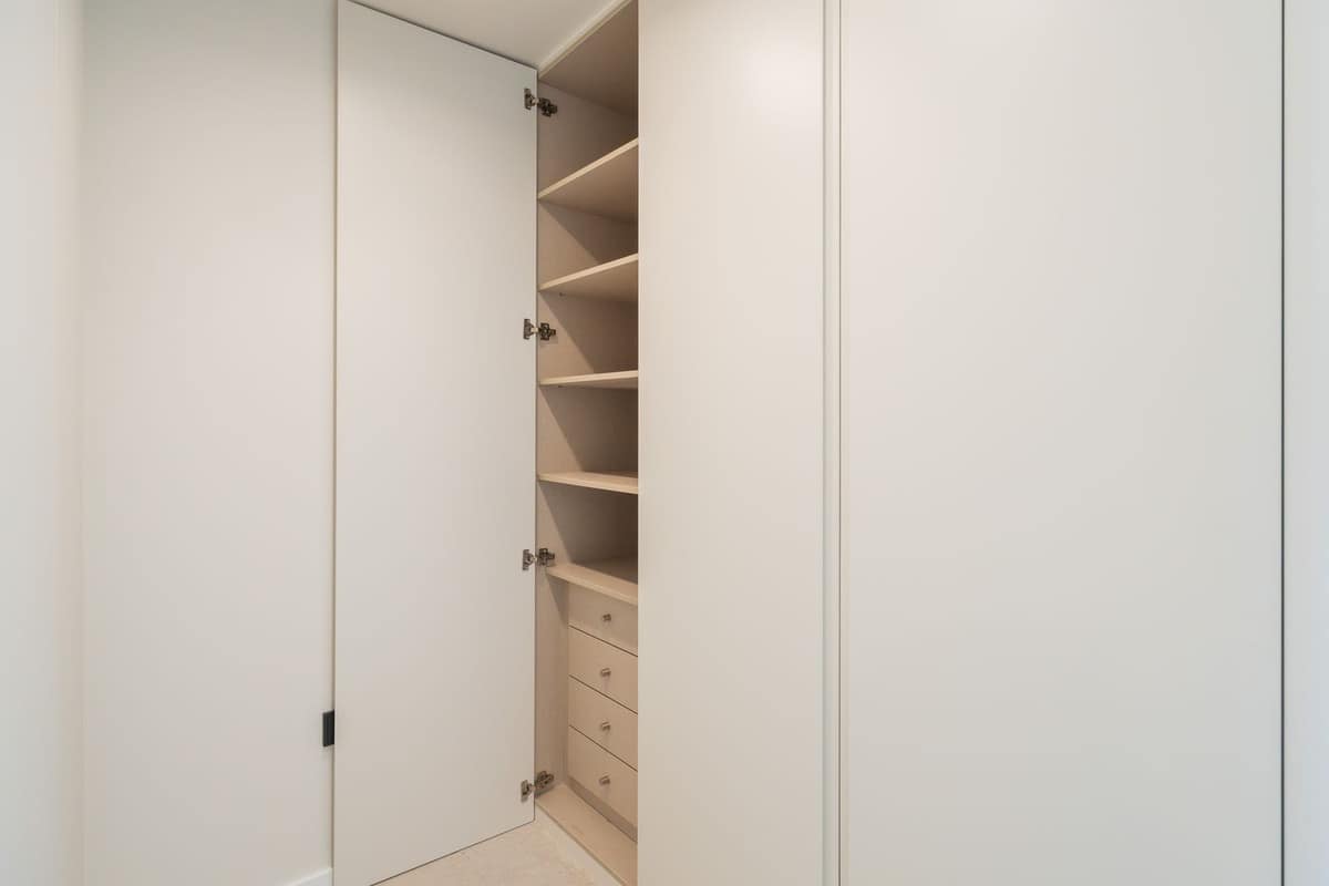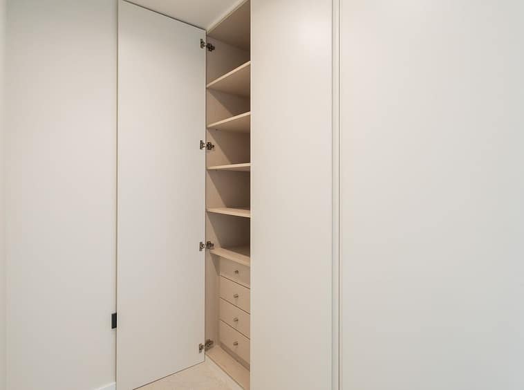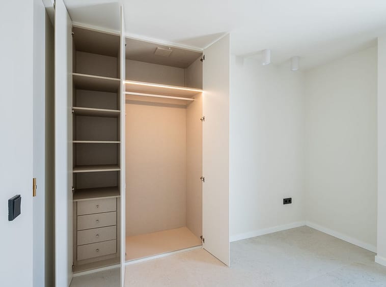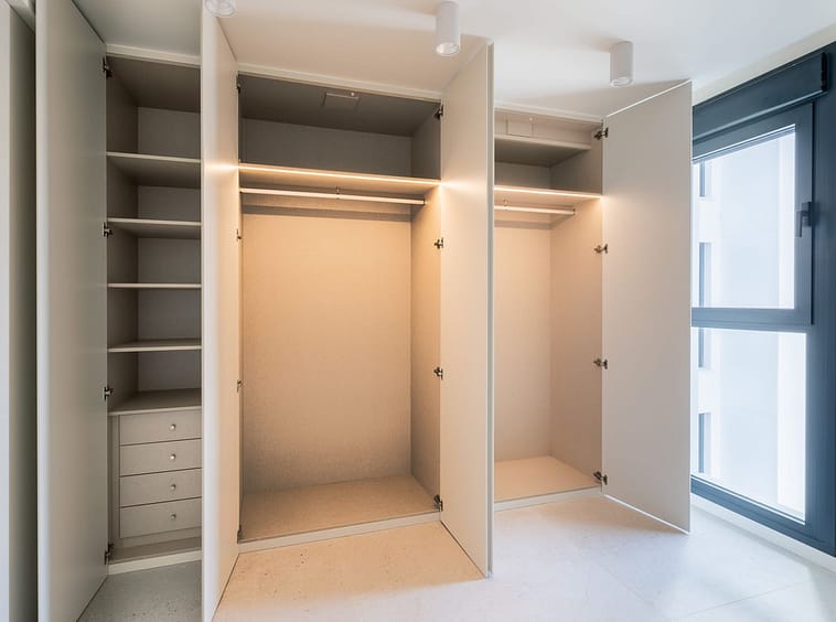 Built-in wardrobes with lined interiors.