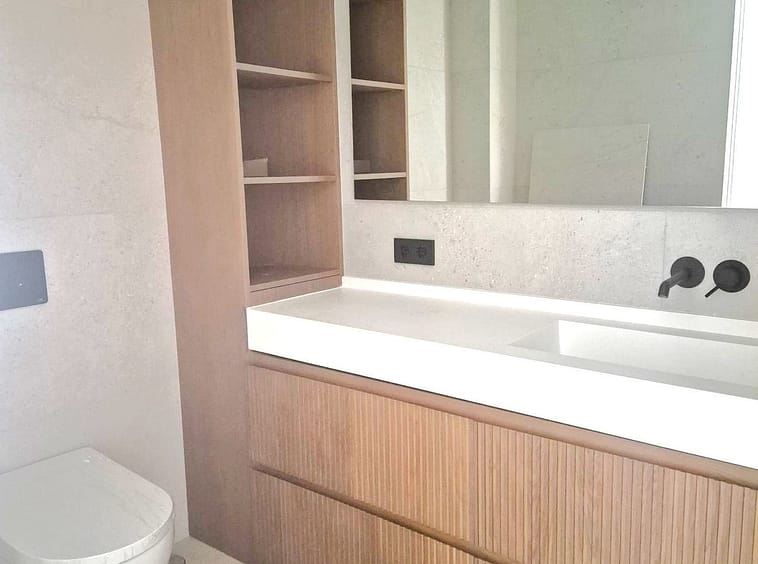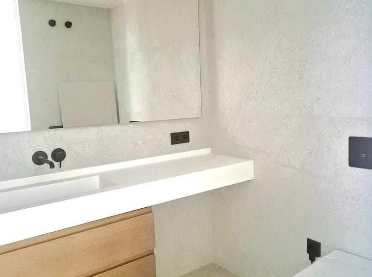 Bathrooms with wall-hung sanitary fixtures, black built-in faucets, and walk-in showers integrated into the floor.