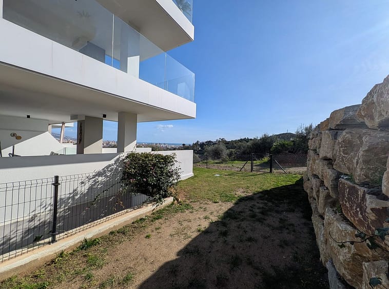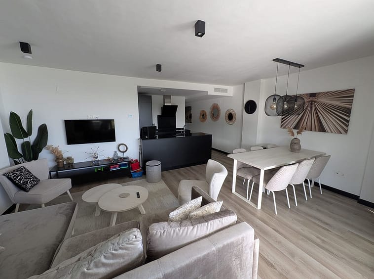 Built in 2023 and presented in excellent condition, the apartment features three bedrooms and two bathrooms, with a bright and exceptionally spacious living area that flows directly onto expansive terraces. The southwest orientation ensures abundant natural light throughout the day, while panoramic views stretch across the Mediterranean Sea, the mountains, and the beautifully landscaped gardens and pool areas.