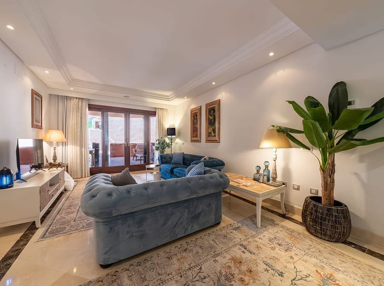 Located on the ground floor, the property enjoys a peaceful setting within beautifully maintained tropical gardens while remaining just moments from the Mediterranean shoreline. The apartment welcomes you with a generous entrance hall that leads into a bright and inviting living and dining area, perfectly designed for relaxed everyday living as well as entertaining guests. Large sliding doors open onto a substantial private terrace, creating a seamless connection between indoor and outdoor living and offering direct access to the communal gardens.