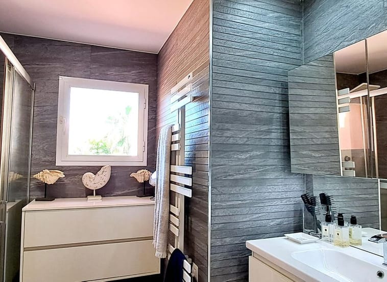 By entering the main level you find the south facing living/ dining area leading out to one of the four terraces, a modern & well equipped brand new kitchen, two bedrooms sharing the renovated modern shower room and as well a guest toilet.