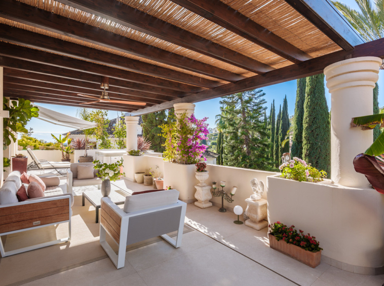 This exceptional and exquisitely designed southwest-facing duplex penthouse offers a stunning panoramic view of the award-winning gardens of Las Alamandas, in Nueva Andalucía, providing an ideal balance of sun and shade across its expansive terrace spaces. Recently refurbished to the highest contemporary standards and incorporating the latest in home automation technology, this remarkable penthouse combines the privacy, luxury, comfort, and elegance of villa living with the added prestige and appeal of residing in one of Marbella’s most sought-after locations.