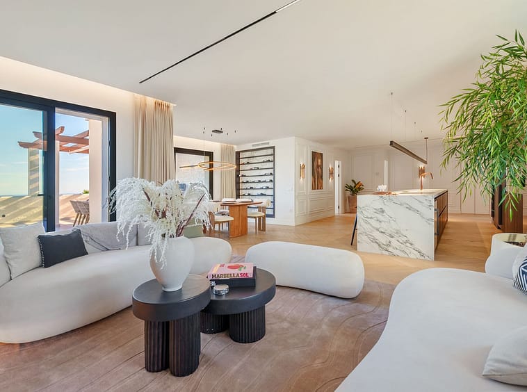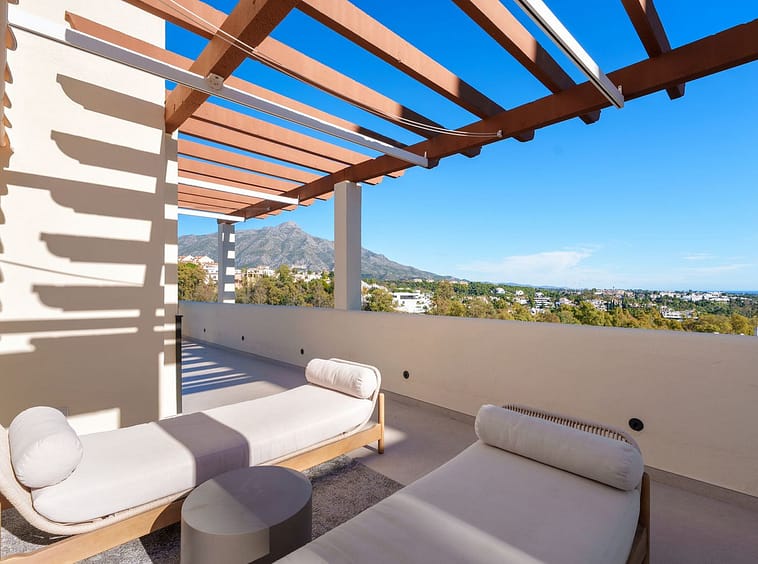 This exceptional duplex penthouse, offered exclusively through sole agency, is located within one of the most prestigious residential developments in Nueva Andalucía, Marbella. Recently refurbished to an impeccable standard, the property showcases a refined blend of contemporary design and warm Scandinavian aesthetics, resulting in an elegant yet welcoming living environment. With a built area of 183 m² and expansive terraces totaling 181 m², the home offers an outstanding balance between indoor comfort and outdoor enjoyment.