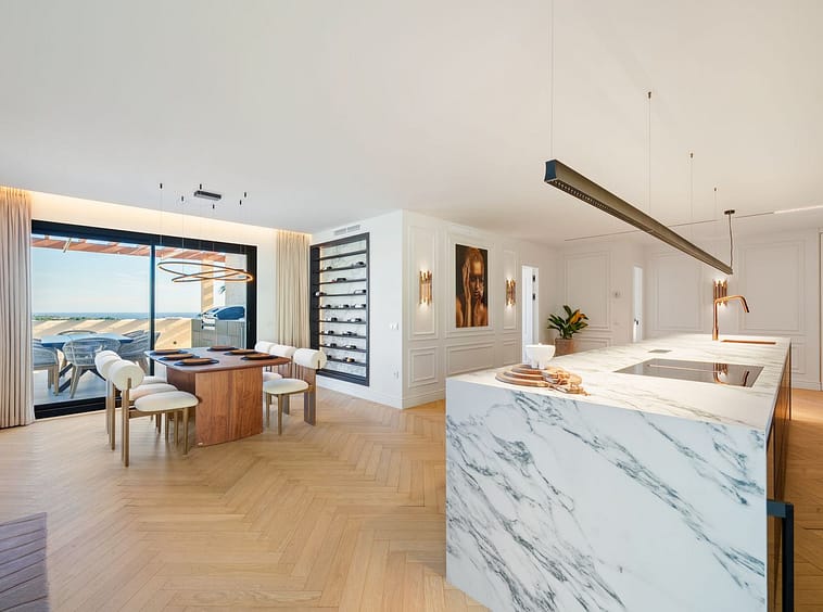 The penthouse features three generously sized bedrooms, each with its own en-suite bathroom, as well as a separate guest toilet. All bathrooms benefit from underfloor heating, while the entire property is finished with herringbone oak flooring, ultra-UV triple-glazed windows and double glazing, ensuring superior comfort, energy efficiency and natural light throughout. The open-plan living and dining area flows seamlessly onto a spacious private terrace, where panoramic sea and mountain views create an impressive backdrop. This outdoor area is further enhanced by a fully equipped outdoor kitchen and barbecue zone, ideal for entertaining or relaxing, complemented by high-quality UV-resistant plants.