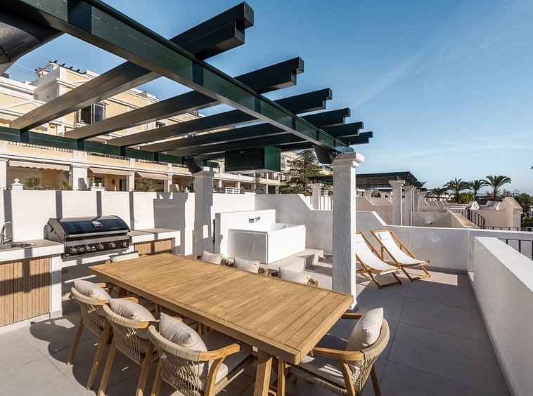 This is a refined duplex penthouse set within the gated community of Aloha Gardens in Nueva Andalucía. This property presents a well-balanced combination of modern design and a prime location in one of Marbella’s most established areas. The main floor is designed for harmonious indoor-outdoor living, featuring an open-plan living and dining space that flows onto a spacious terrace—ideal for relaxing or entertaining. A sleek kitchen layout and a guest toilet add convenience to this level. Upstairs, the night area offers three well-proportioned bedrooms. The primary suite enjoys a large wardrobe area, an en-suite bathroom, and direct access to a private terrace. From here, a staircase leads to the rooftop solarium, offering a quiet retreat with open-air potential. Two additional bedrooms share a well-appointed bathroom, ensuring both privacy and comfort for guests or family members. Located in the heart of Nueva Andalucía, it benefits from the amenities of Aloha Gardens, including three communal swimming pools. Just beyond the gates, residents enjoy proximity to some of Marbella’s best restaurants, boutique shops, tennis clubs, and golf courses. This is an exceptional opportunity to acquire a fully renovated penthouse in a highly regarded residential enclave.
