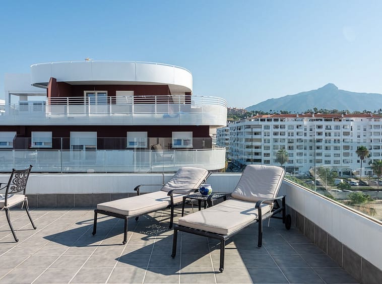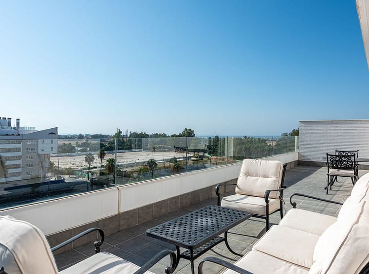 We are pleased to present this bright and modern penthouse in the best location in Nueva Andalucía! Enjoy modern living within proximity to all the amenities you need; grocery stores, bars, restaurants, schools, health center, golf courses, gym, and much more. A perfect choice for both families and investors. In a 20-minute walk you will reach the sea and the lovely promenade that stretches from San Pedro via Puerto Banús to Marbella Center. The apartment has three bedrooms, two bathrooms, a kitchen, a living room, and a terrace with generous spaces for relaxation and entertainment. A garage space and a storage room are included. Don't miss this unique opportunity to invest in one of Marbella's fastest-growing residential areas!