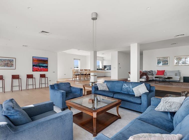 Stepping into this stunning property, you are greeted with a well-appointed entry hall, leading to a bright living area. To your right, you'll find a modern, open-plan kitchen, as well as a dining area. On the other side, the vast living room continues to a tranquil lounge area that’s filled with natural light. All bedrooms blend style and luxury, with the master bedroom offering direct access to the terrace and breathtaking sea views.