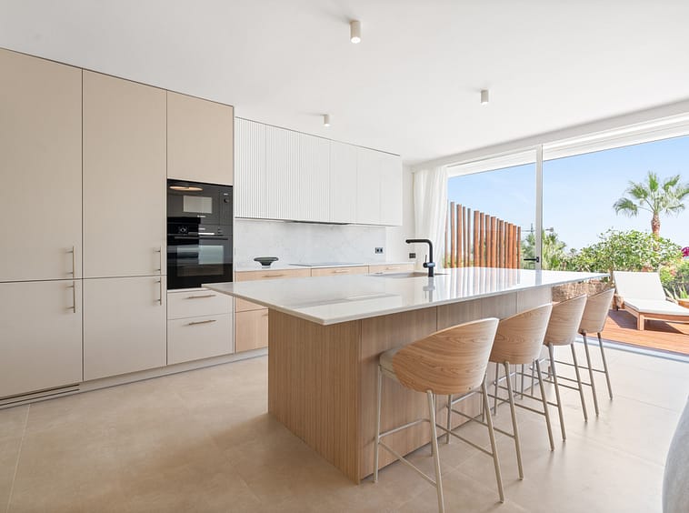 Designed with a contemporary vision, the property combines premium materials, refined aesthetics and functional design to create a modern living environment. The interiors are bright and open, with a spacious living and dining area flowing into a sleek designer kitchen equipped with high-end appliances. Natural tones and clean lines enhance the atmosphere, while large glass doors lead to a south-facing terrace with panoramic views of the Mediterranean and the lush communal gardens below.