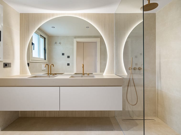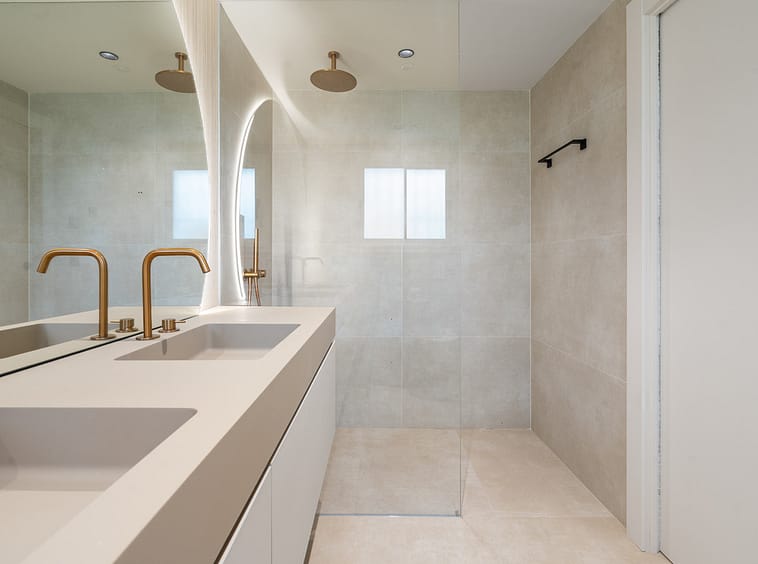 Each of the three bedrooms is fitted with bespoke wardrobes, and the bathrooms feature Italian fixtures, porcelain finishes and integrated lighting that highlight the home’s modern architecture. The renovation has been carefully executed to provide both comfort and sophistication in every detail.