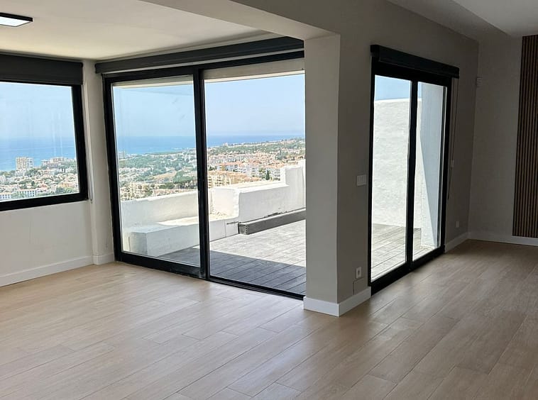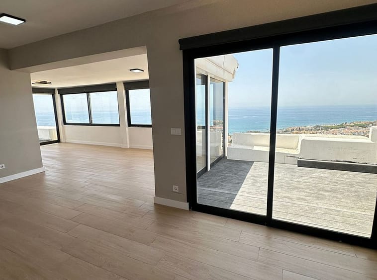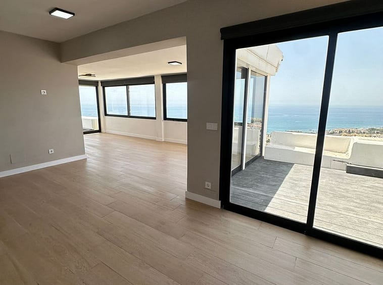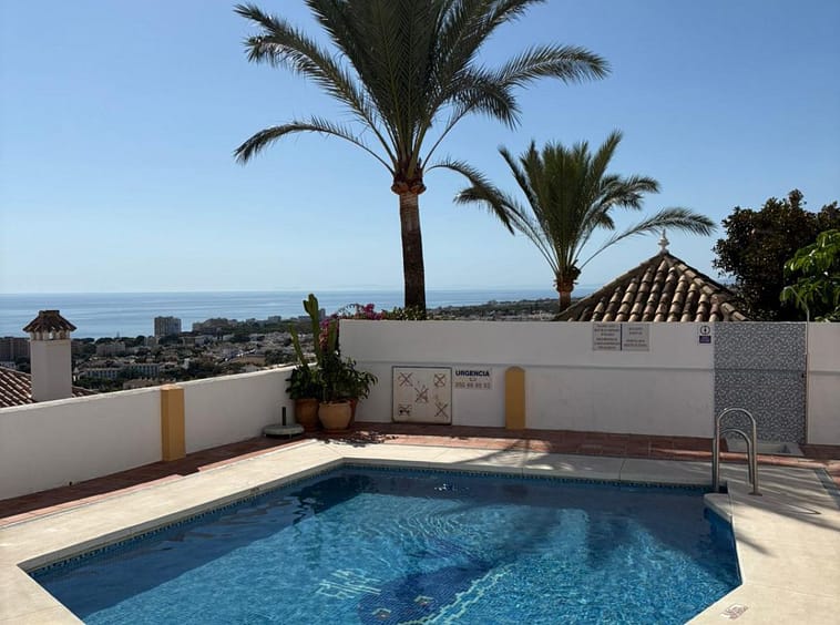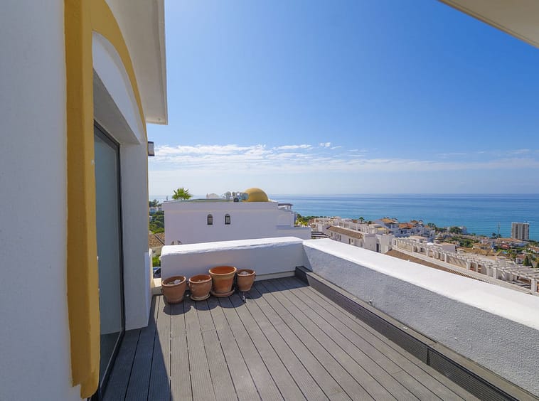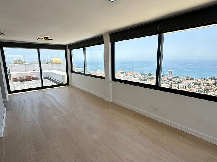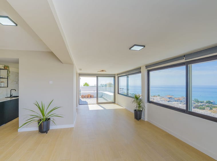 We offer this wonderful penthouse for sale in the coastal town of Mijas, province of Málaga. Located in a gated community with a communal pool and well-maintained landscaped areas, this apartment will make your stay a healthy experience, filling you with vitality and good humor. 17 km from the center of Málaga city, it will provide you with access to all the services and facilities you may need (shops, supermarkets, sports, educational, and health centers, public transportation, hospitality and catering services, government offices, and leisure facilities, such as the Miraflores Golf Course (1.7 km) or Torre Nueva Beach (2 km), among others. This wonderful home is located on a single floor and is located in the penthouse of a residential building. This first-floor apartment, with no elevator, occupies an exclusive wing of the floor, ensuring privacy as it is not shared with neighbors. It has a constructed area of 115 m², distributed among: 3 bedrooms with built-in wardrobes, a separate kitchen, two full bathrooms (one en suite), and a spacious living-dining room with access to a 22 m² terrace. This spacious area, which seems to divide the terrace in two, is located inside the living room. It features large windows and large glass doors, from which you can enjoy the beautiful 360º panoramic sea views in any season, regardless of the weather (it is sunny for most of the day). You can also spend unforgettable moments with your loved ones enjoying the beneficial Mediterranean climate on the terrace on summer nights.