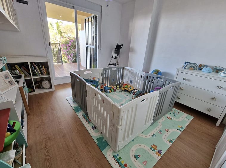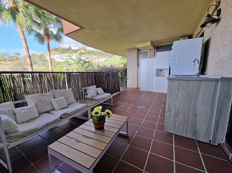 Price reduction !! Immaculate, beautifully reformed, spacious ground floor duplex apartment with 2 terraces, private garden AND sea and pool views!! Located in a quiet corner of this fabulous community, the apartment, at entry level, consists of hallway,, large lounge/dining room, modern fully equipped kitchen, double bedroom (currently used as an office), bathroom and a wonderful terrace from which stunning sea, garden and pool views can be enjoyed. Downstairs, we find another double bedroom, master bedroom with ensuite bathroom and another terrace, again with beautiful views. Then the lovely recently renovated private garden, with grass, plants, fruit trees and a laundry area. There is parquet flooring throughout the property, with the exception of the bathrooms and kitchen. The property also has a storage room of 6m2.