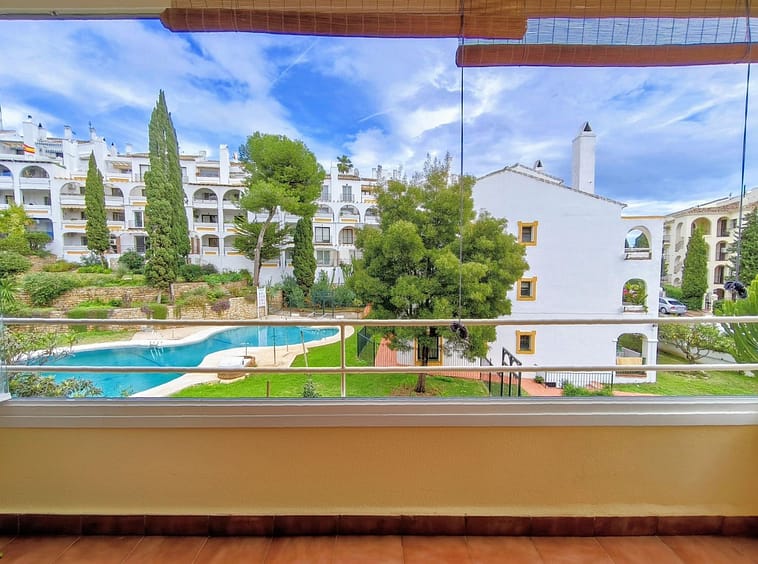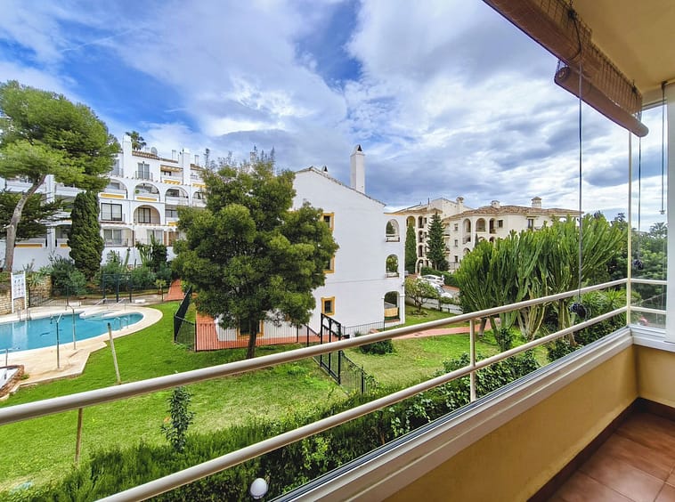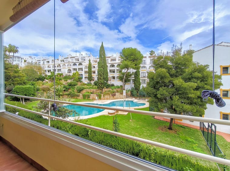 The apartment comprises a hallway, lounge, modern fully fitted kitchen, 3 double bedrooms, bathroom, and good sized terrace with glass curtains, allowing for use of this space in all weathers, overlooking the pool and gardens.