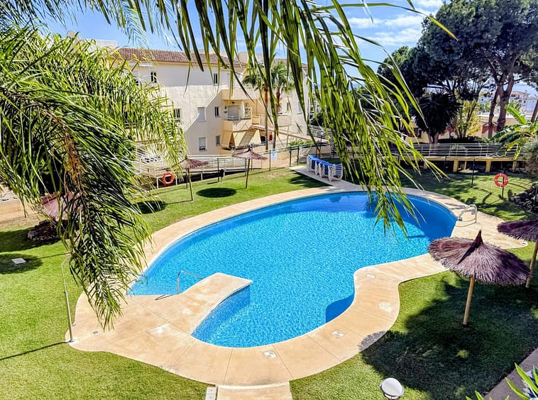 The community is immaculately maintained, with large lawns and sunbathing areas around the large swimming pool and children's pool, and has a gated driveway leading to an open communal car park.