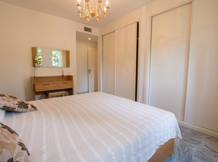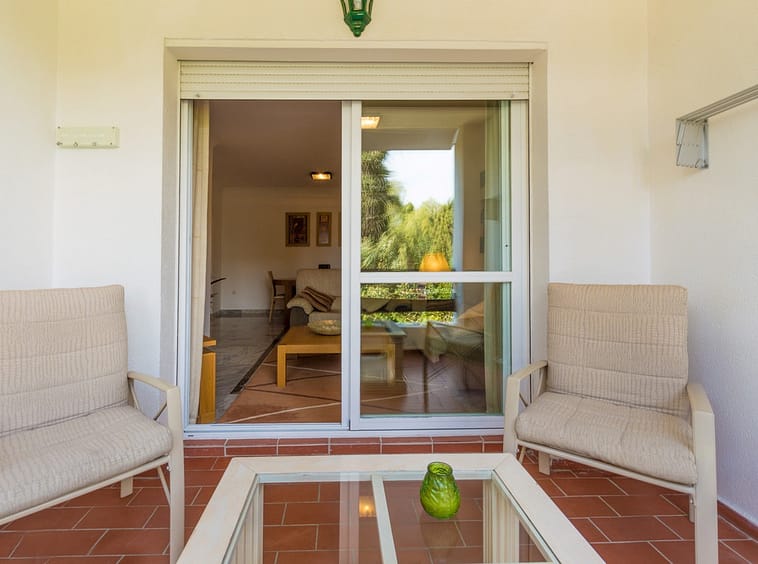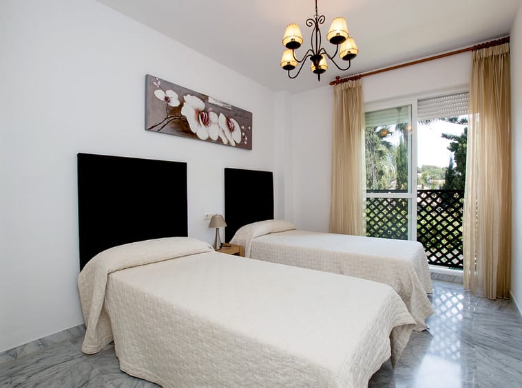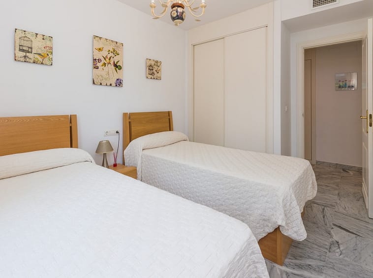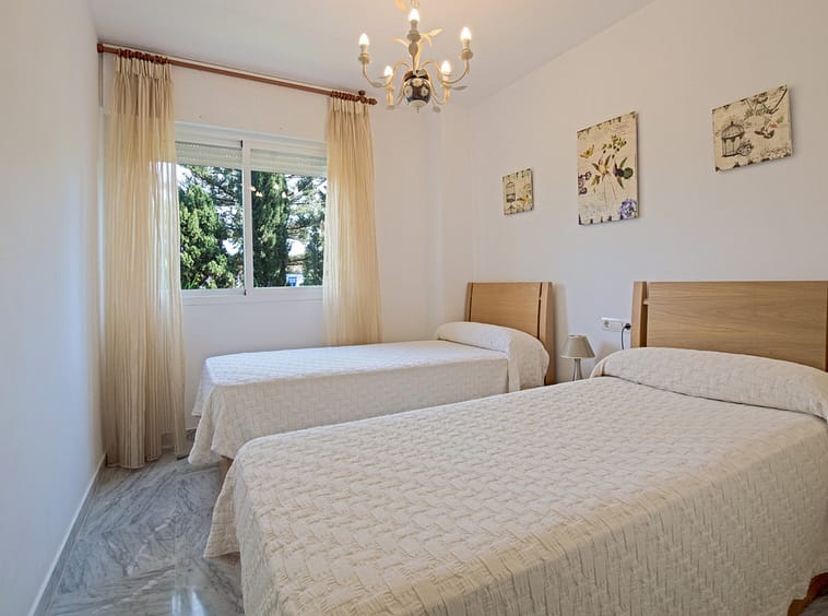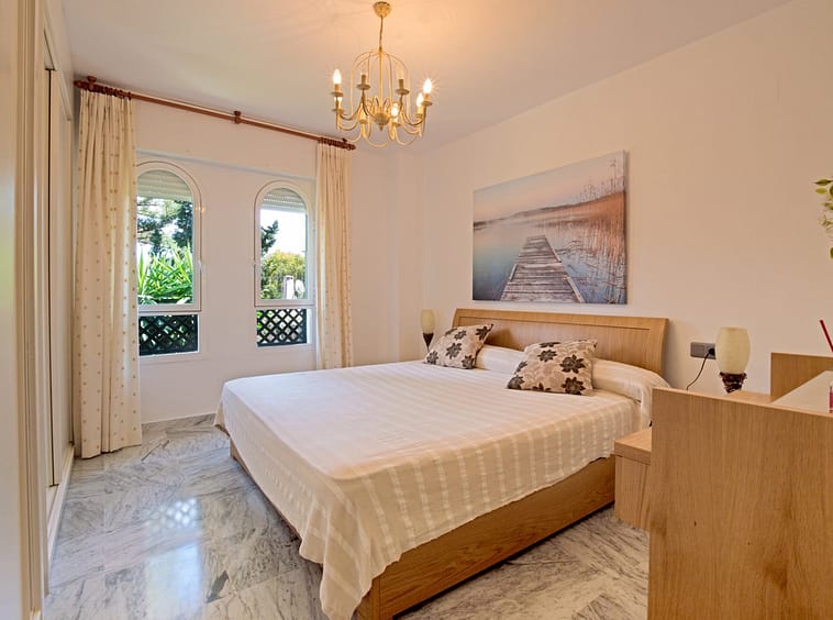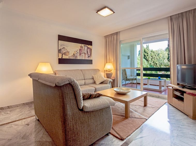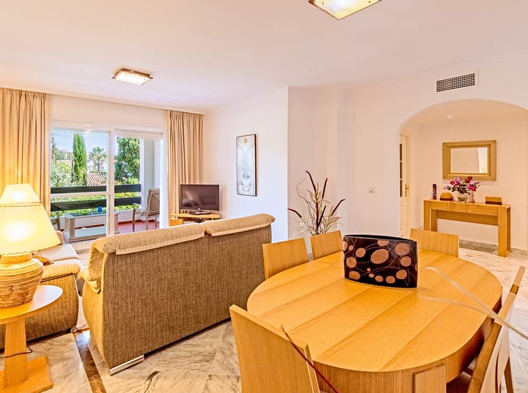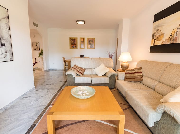 Spectacular apartment with 3 bedrooms, 2 bathrooms and 125m2 of interior, located on the 1st floor, facing east. Furnished and decorated with attention to detail, the property consists of an entrance hall, a spacious living-dining room with access to a fantastic covered terrace of 10m2 with views of the mountains and the gardens of the urbanization. 3 bright bedrooms (one of them ¨en-suite¨), with fitted wardrobes and double glazed windows, second bathroom and a separate and fully equipped kitchen. Marble floors, hot and cold air conditioning, television and internet installation.