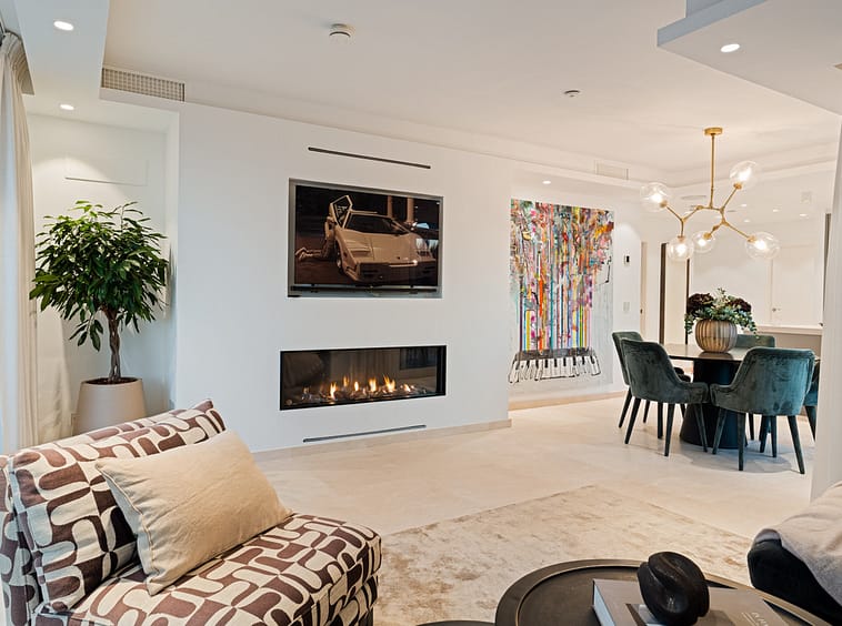 Every element of Penthouse Horizon reflects quality and contemporary craftsmanship. The residence features underfloor heating throughout, providing comfort in all seasons, and an integrated Bang & Olufsen sound system that enhances the living experience with high-end acoustics. The attention to modern convenience continues with electric blinds in each room and access to two communal swimming pools within the gated community, offering residents both security and leisure. The development also benefits from well-maintained gardens and extensive communal parking, ensuring practicality for everyday living.