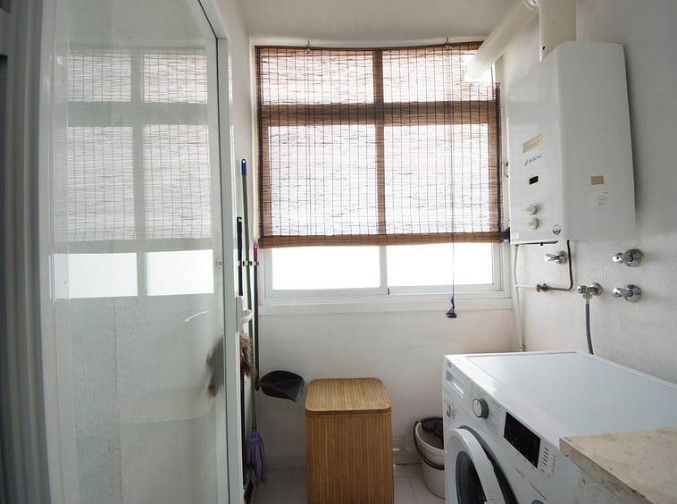 It includes a separate kitchen with ample storage and a practical utility room/laundry area with space for a washing machine and gas water heater/boiler.