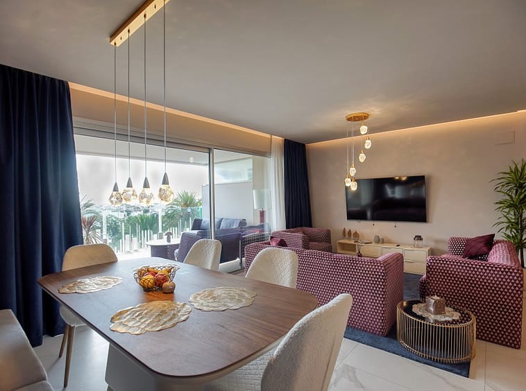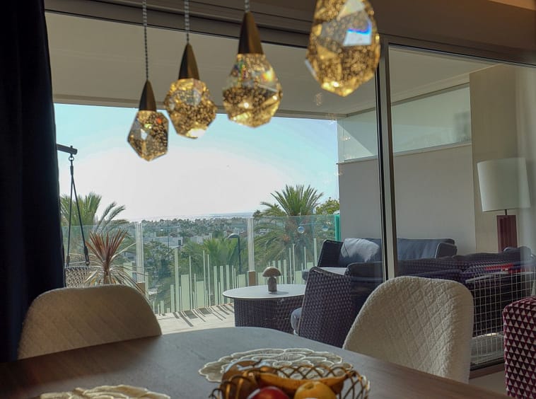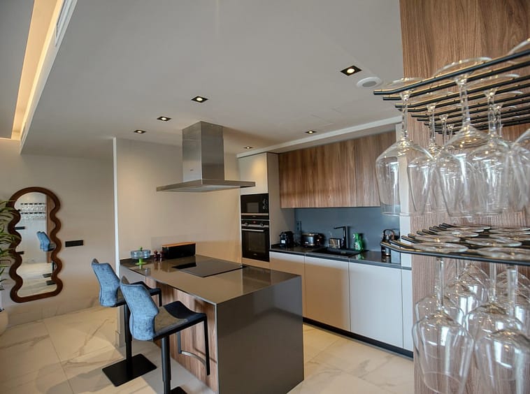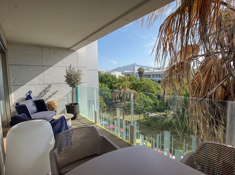 Stunning fully furnished 3-bedroom apartment located on the middle floor of a modern beachside complex in San Pedro de Alcántara. This east-facing home features a spacious open-plan living and dining area leading to a large covered terrace, ideal for relaxing or entertaining. The kitchen is fully equipped with premium appliances and includes a separate utility room.
