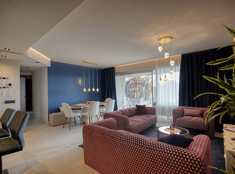 The master bedroom has an en-suite bathroom, while the two additional bedrooms share a modern family bathroom. High-quality finishes throughout, including marble floors, double-glazed windows, and central air conditioning for year-round comfort.